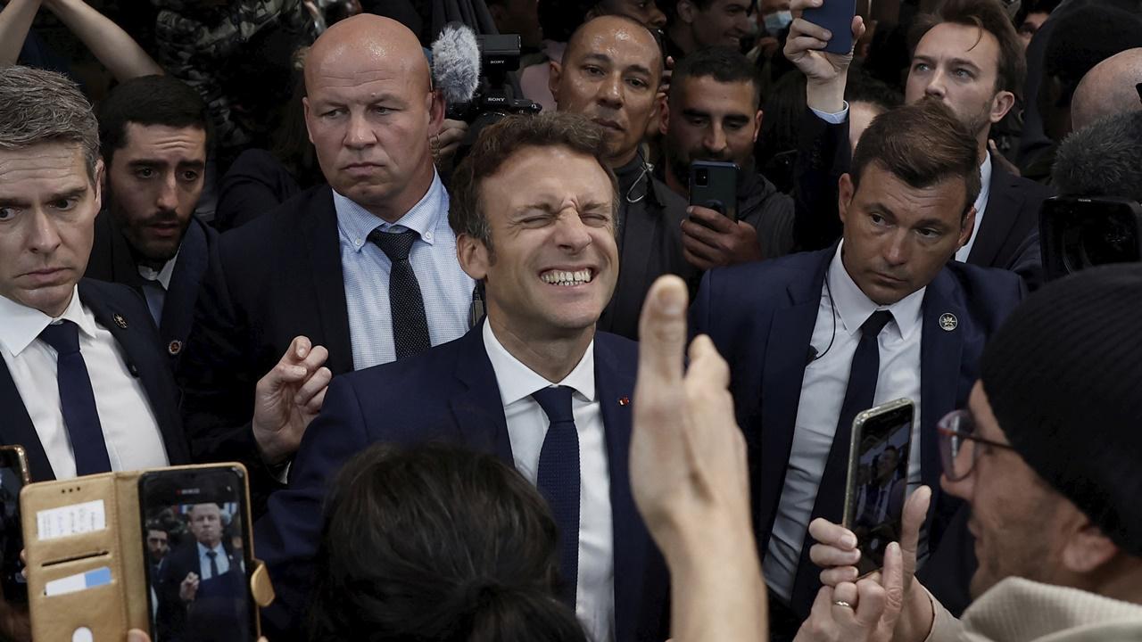 馬克龍成功連任後首度落區,險被車厘茄擲中。(AP)