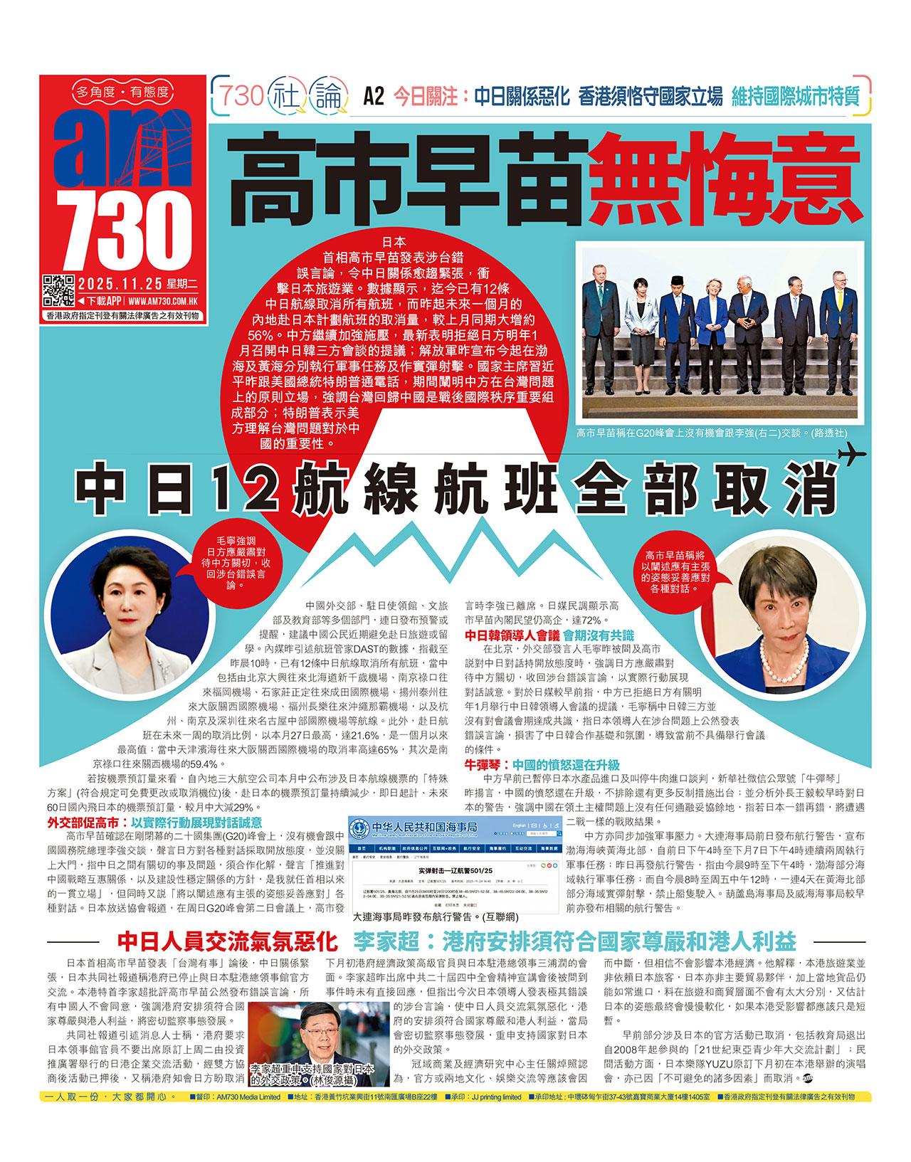 日本首相高市早苗發表涉台錯誤言論,令中日關係愈趨緊張,衝擊日本旅遊業。數據顯示,迄今已有12條中日航線取消所有航班,而昨起未來一個月的內地赴日本計劃航班的取消量,較上月同期大增約56%。中方繼續加強施壓,最新表明拒絕日方明年1月召開中日韓三方會談的提議;解放軍昨宣布今起在渤海及黃海分別執行軍事任務及作實彈射擊。國家主席習近平昨跟美國總統特朗普通電話,期間闡明中方在台灣問題上的原則立場,強調台灣回歸中國是戰後國際秩序重要組成部分;特朗普表示美方理解台灣問題對於中國的重要性。