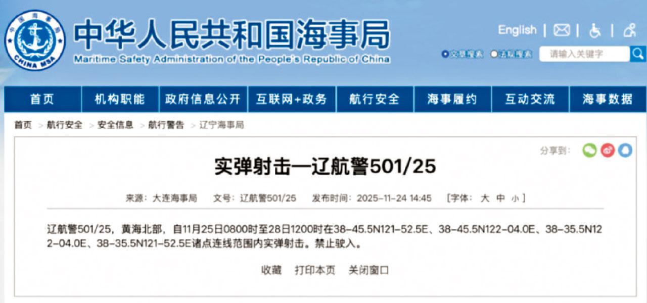 中方亦同步加強軍事壓力。大連海事局前日發布航行警告,宣布渤海海峽黃海北部,自前日下午4時至下月7日下午4時連續兩周執行軍事任務;昨日再發航行警告,指由今晨9時至下午4時,渤海部分海域執行軍事任務;而自今晨8時至周五中午12時,一連4天在黃海北部部分海域實彈射擊,禁止船隻駛入。葫蘆島海事局及威海海事局較早前亦發布相關的航行警告。
