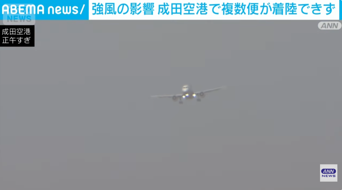 報道指,受強烈季候風影響,日本千葉縣多處風力急遽增強,成田機場附近觀測到的陣風達每秒20.1米。報道指,受影響的航班被逼改往名古屋的中部國際機場和大阪的關西機場降落。
