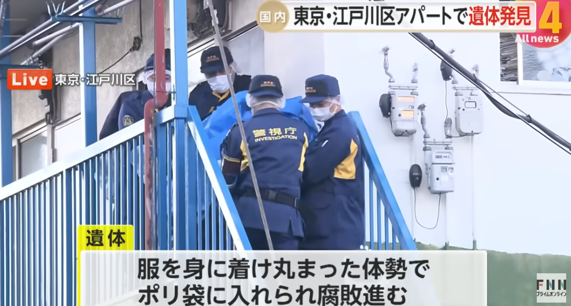 日本東京發生離奇命案。現場為江戶川區一個單位,租客2個月前在單位內離世,房東周二(13日)中午在屋內清理時,打開衣櫃並聞到一個紙箱傳出異味遂報警。警員到場後,打開紙箱一看竟藏著一具嚴重腐爛的遺體。