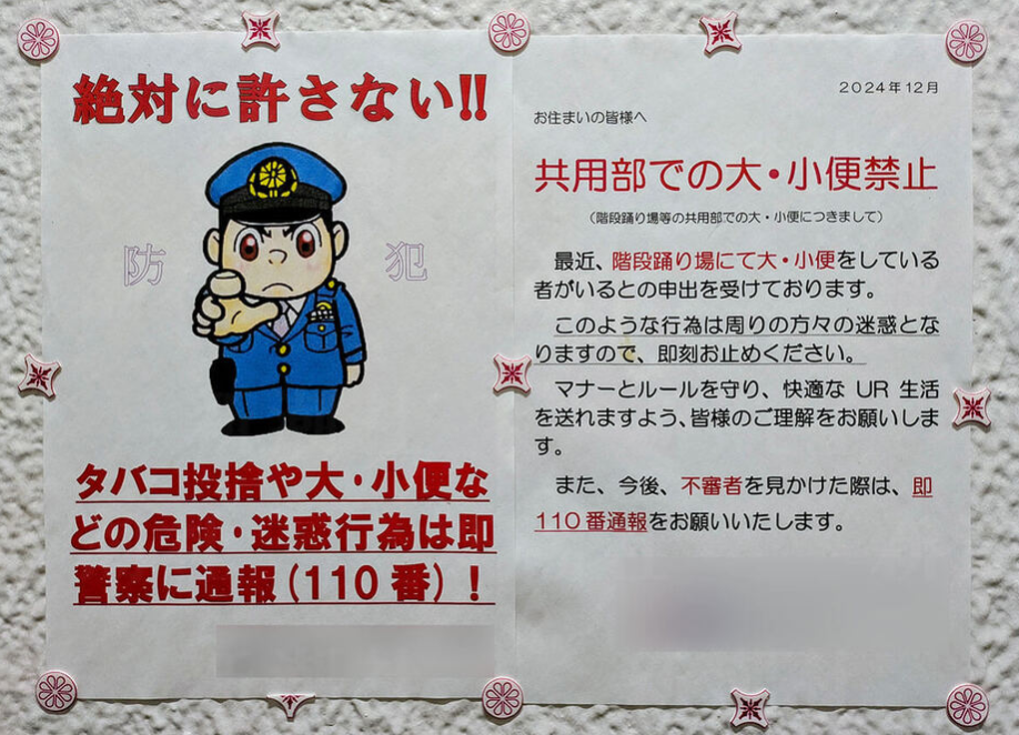 日本東京葛飾區的一處住宅大樓,貼出告示呼籲居民不要在樓梯便溺。(《週刊新潮》截圖)