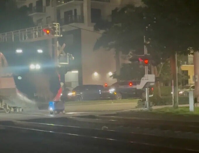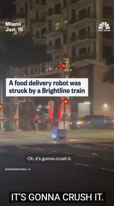 美國邁阿密一名市民拍攝到外賣機械人遭高速火車慘烈輾過一幕。報道指,那個如買餸車的外賣機械人當時無載外賣,失靈停在火車路軌上,聽到拍片者驚呼火車就快撞上它了,旁邊聽到狗吠聲,大家都好擔心外賣機械人的安危。火車還鳴笛警告,下一刻便直撞路軌上的外賣機械人,產生巨響。