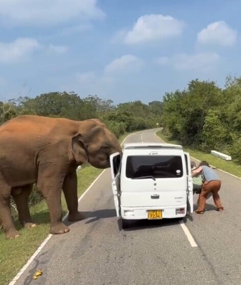 南亞國家斯里蘭卡近日發生一宗野生大象攻擊遊客事件。俄羅斯一個家庭在當地參加野生動物之旅,乘搭觀光車期間餵食野生大象,詎料大象為索取更多食物,將長鼻伸進車內「搜索」,使車身劇烈搖晃,嚇得遊客趕緊下車逃生,最後大象連車門也扯下。