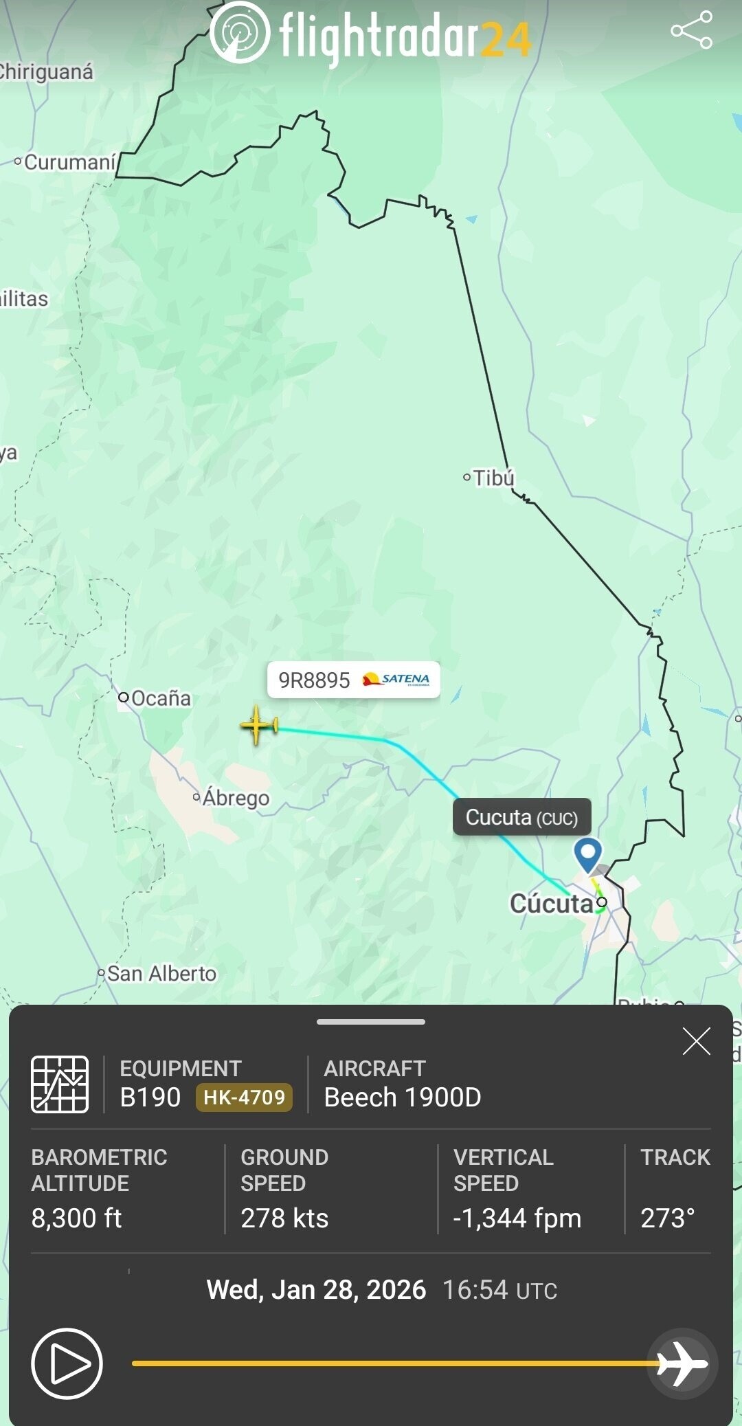 航班追蹤網站FlightRadar24亦顯示,飛機由卡米洛達薩機場(Camilo Daza airport)起飛後僅9分鐘,訊號便完全消失。報道指,機上有13名乘客和2名機組人員,乘客名單包括哥倫比亞議員Diógenes Quintero及他的助手,以及一名3月國會選舉的參選人。
