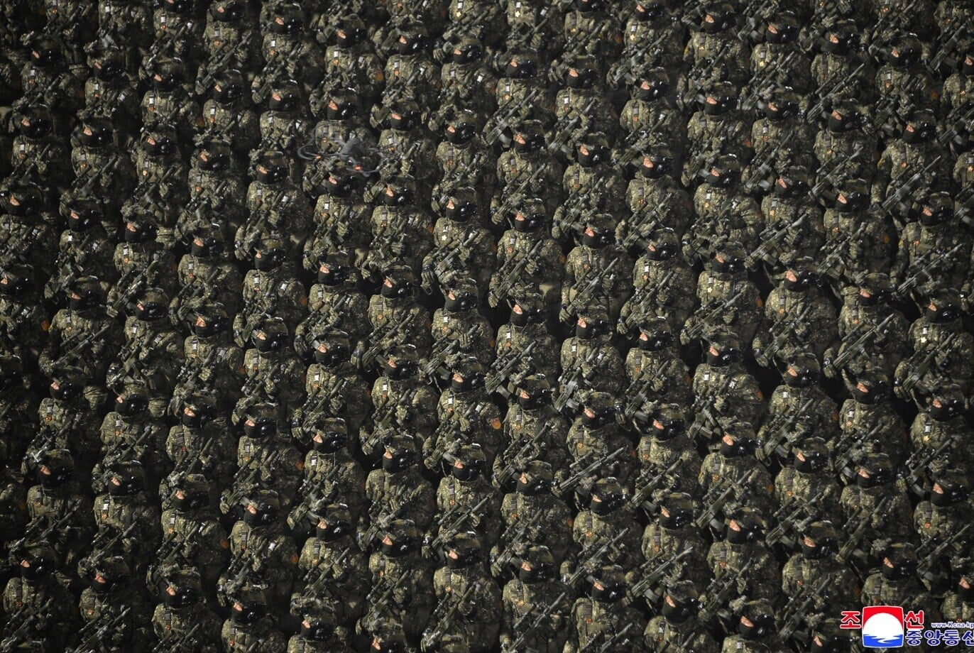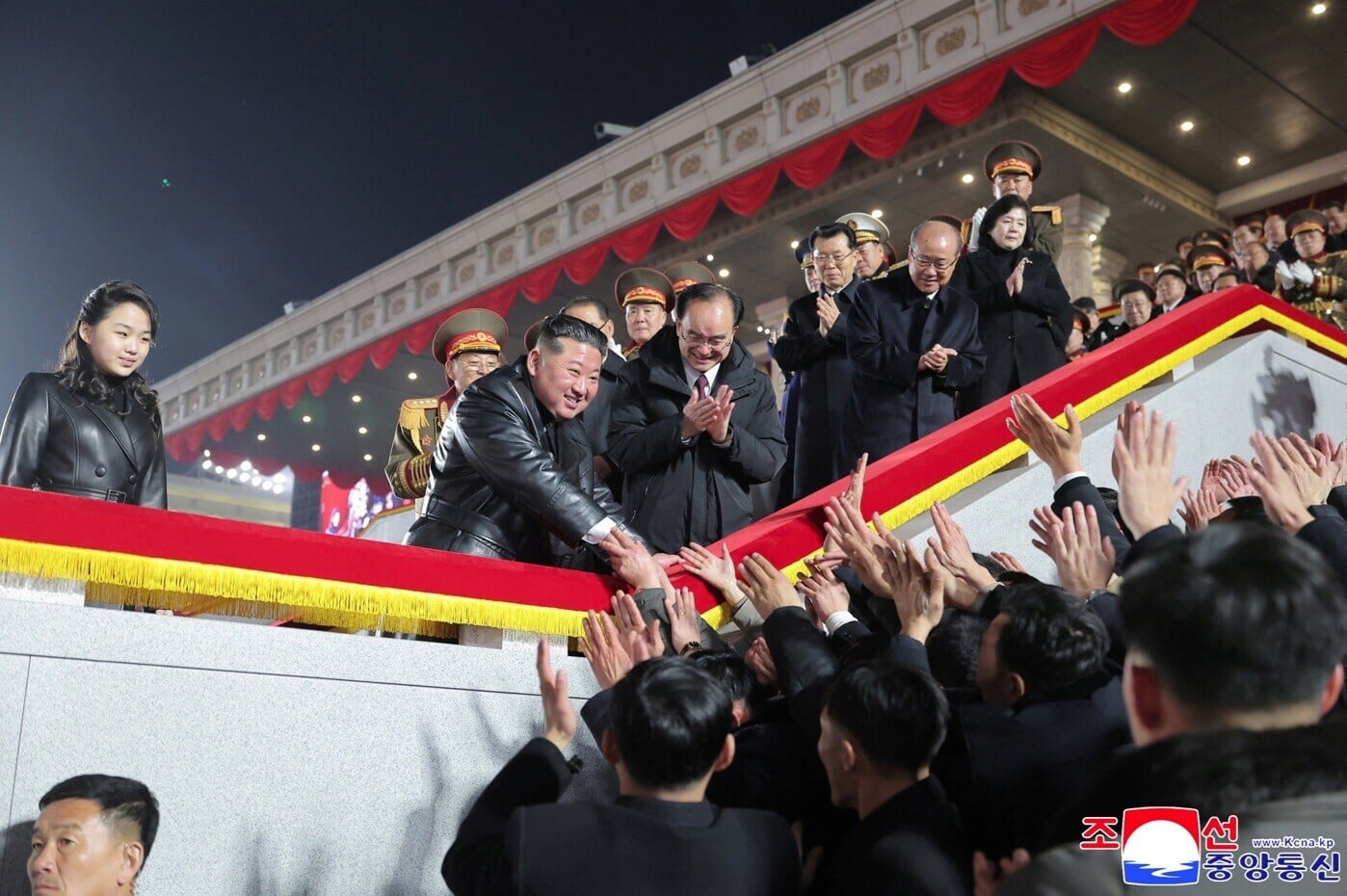 在平壤夜間閱兵的主禮台上,金主愛佔據C位在父親金正恩身旁與多名軍方高層一起觀看軍隊列陣。(路透社)