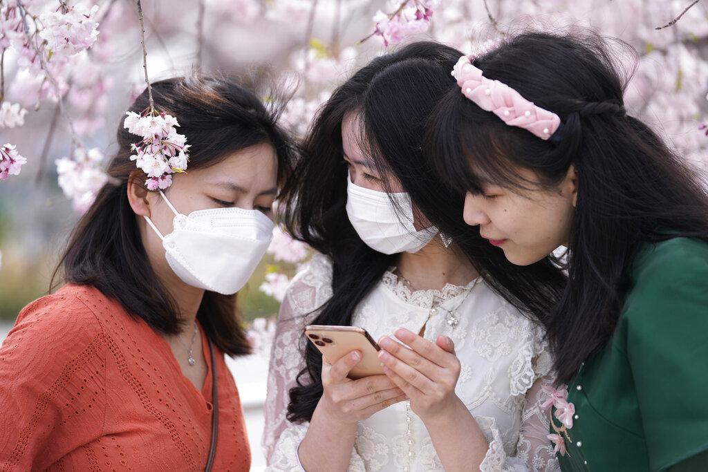 日本踏入櫻花季節,圖為三名越南女子結伴賞櫻。(美聯社)