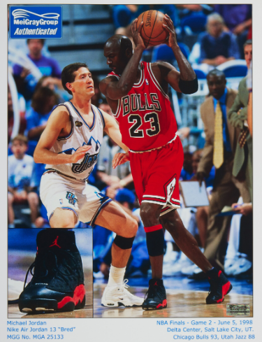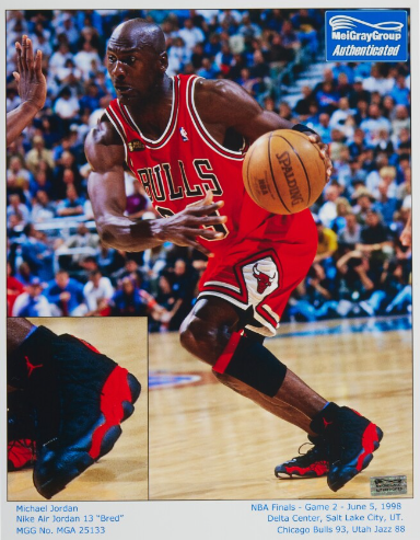 拍出天價的該對Air Jordan 13於1998年6月5日在芝加哥公牛以93比88擊敗猶他爵士的賽事中登場,米高佐敦穿著它攻下全場最高的37分。據報米高佐敦賽後在球鞋上簽名,贈予一名球童。蘇富比未有透露買家身份,並指賣家並非當初從米高佐敦收下球鞋的球童。