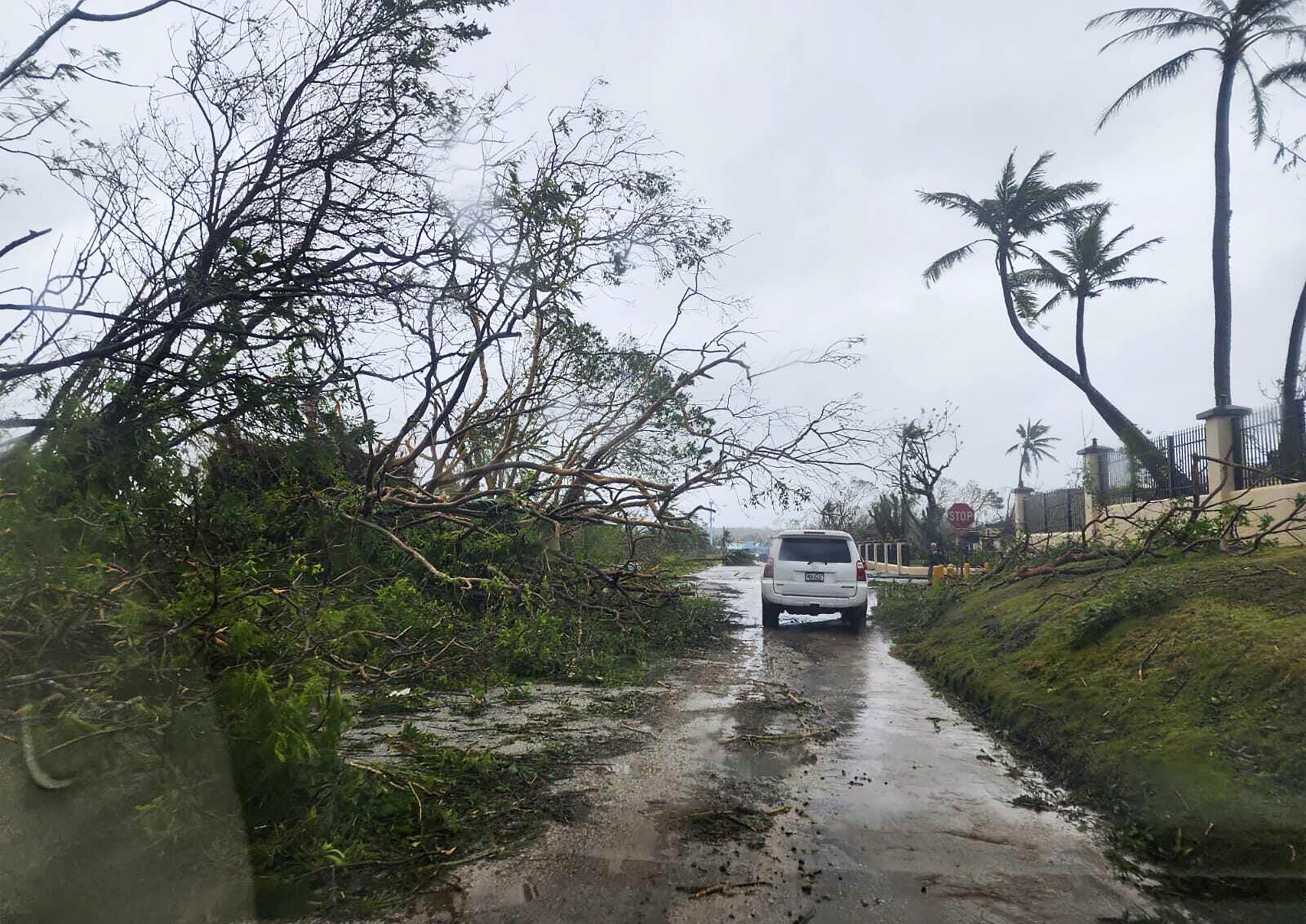 關島一處街道被強風暴雨颳得滿目瘡痍。(圖/美聯社)