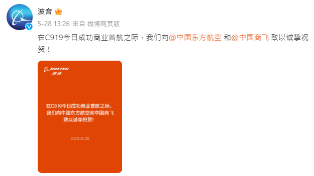 上周日(5月28日)當日,波音曾在微博發文,祝賀中國國產大飛機C919完成商業航班首飛,而中國商飛公司當時亦在評論區表示感謝;而另一飛機製造商空中巴士亦有發文祝賀。