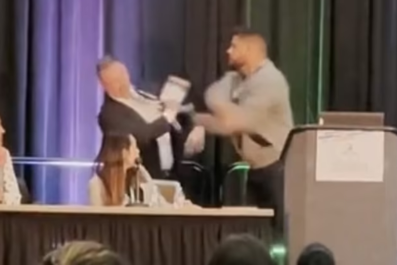 男子在會議中突然衝上台,抓著一名醫生的衣領破口大罵。(圖/翻攝推特)