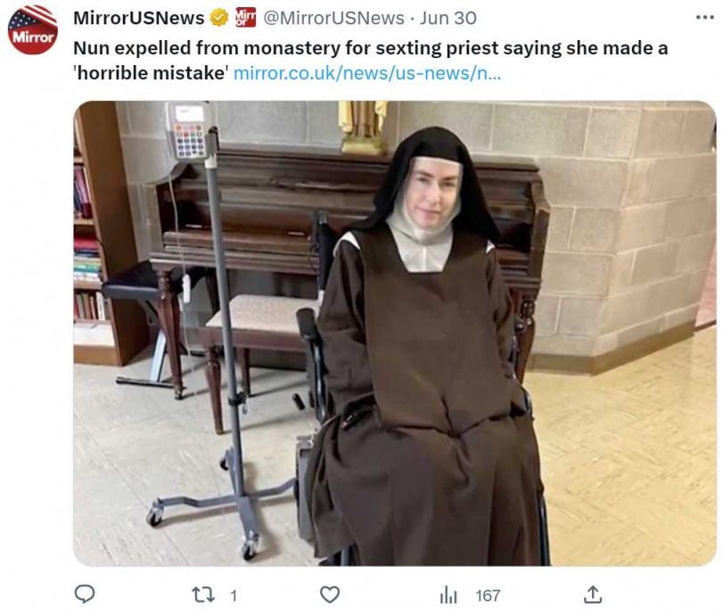 美國德州(Texas)一名身障女修道院長日前被主教依「違背貞潔誓言(vow of chastity)」趕出修道院,原因是她被發現與神父「調情」,不過這名修道院長辯稱癲癇發作「思緒混亂」,且只有「互傳鹹濕短訊」,她被驅逐後反而提出告訴,指控主教侵犯她的私隱,違法沒收手機和毀謗,求償100萬美元(約783萬港元)。