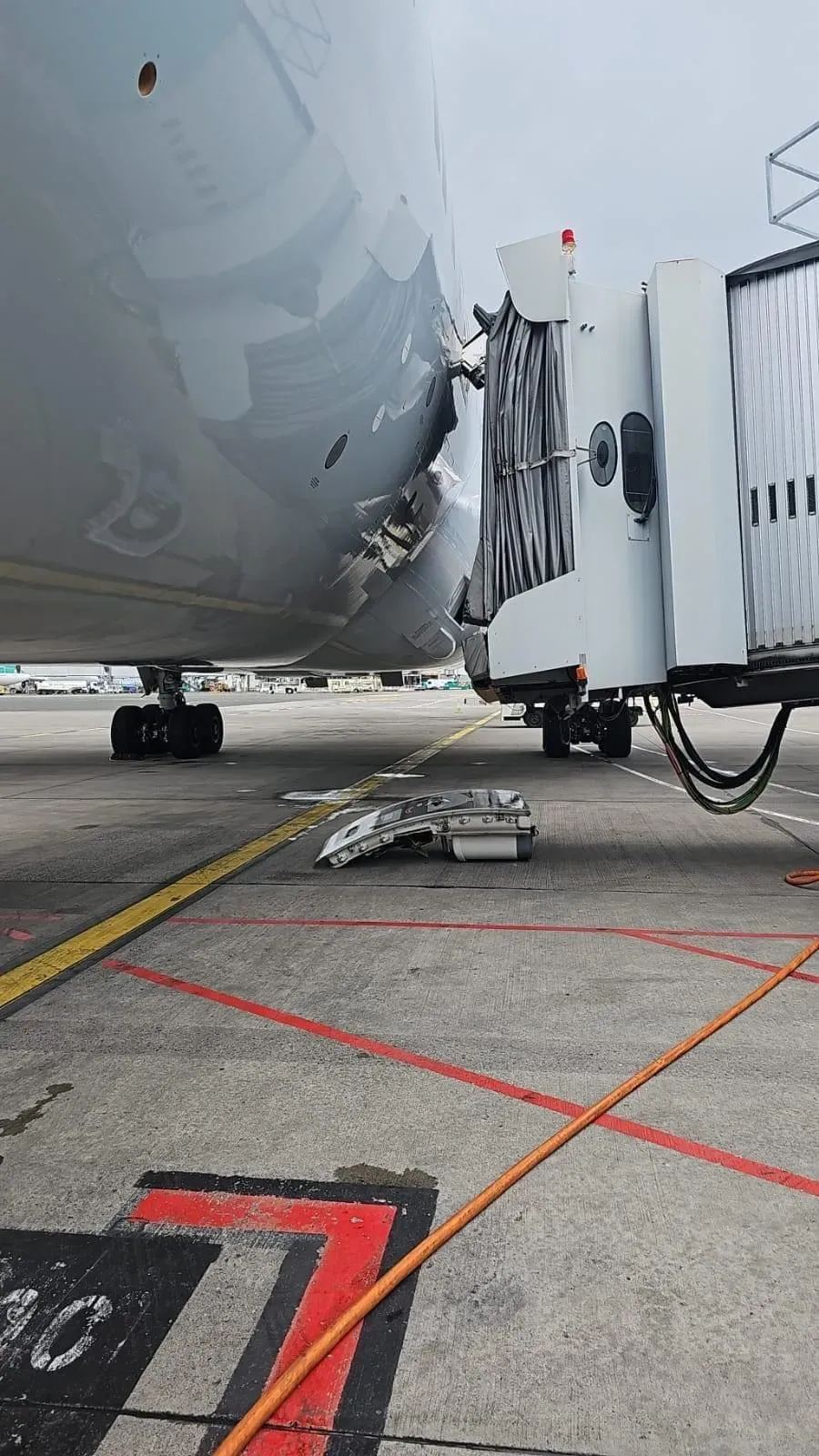 一架波音因為空橋突然倒塌,扯落機艙門。(圖/翻攝推特jaan)