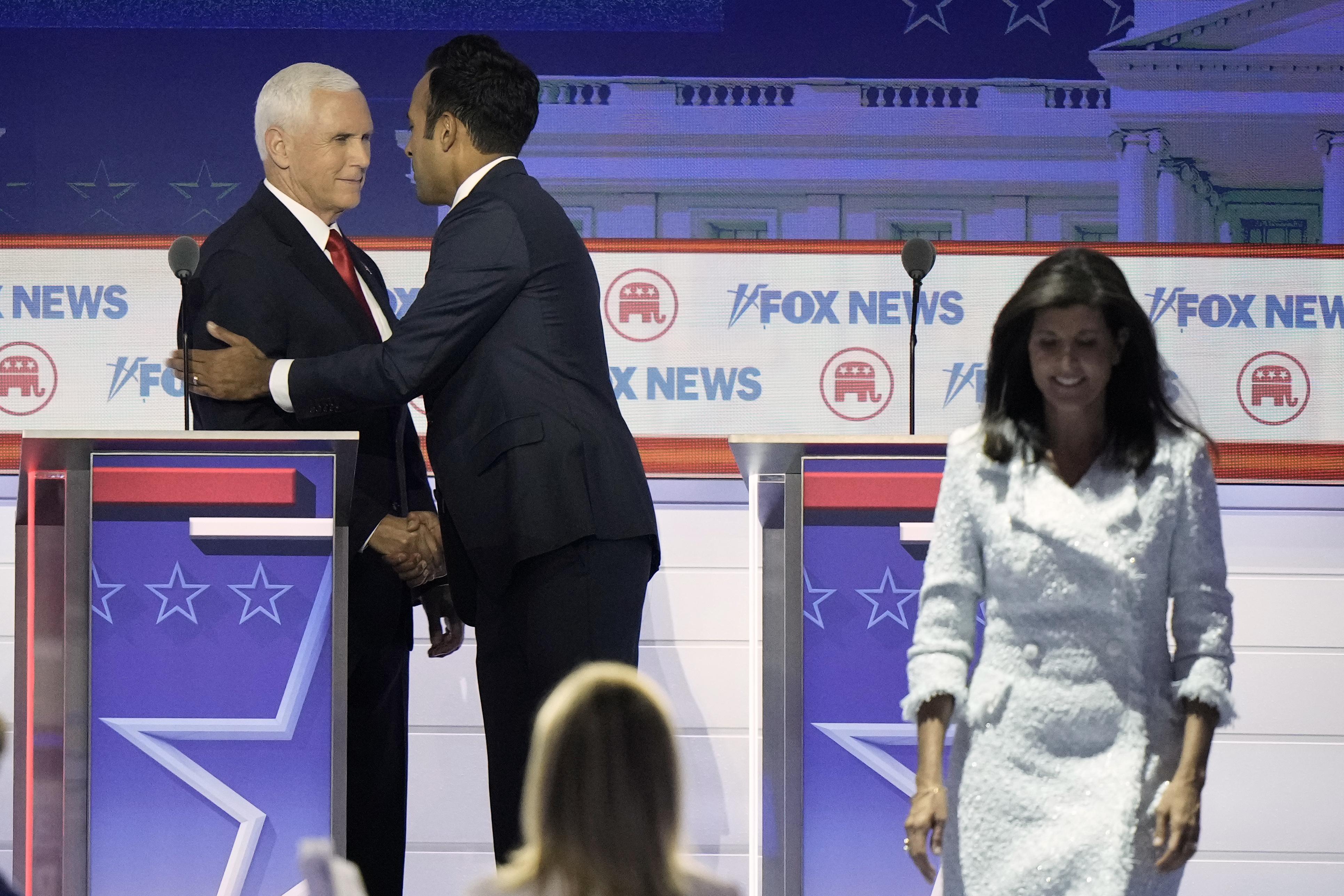 共和黨第一次初選辯論,由左而右分別為前副總統彭斯、拉馬斯瓦米、前南卡羅萊納州州長海利。(圖/美聯社)