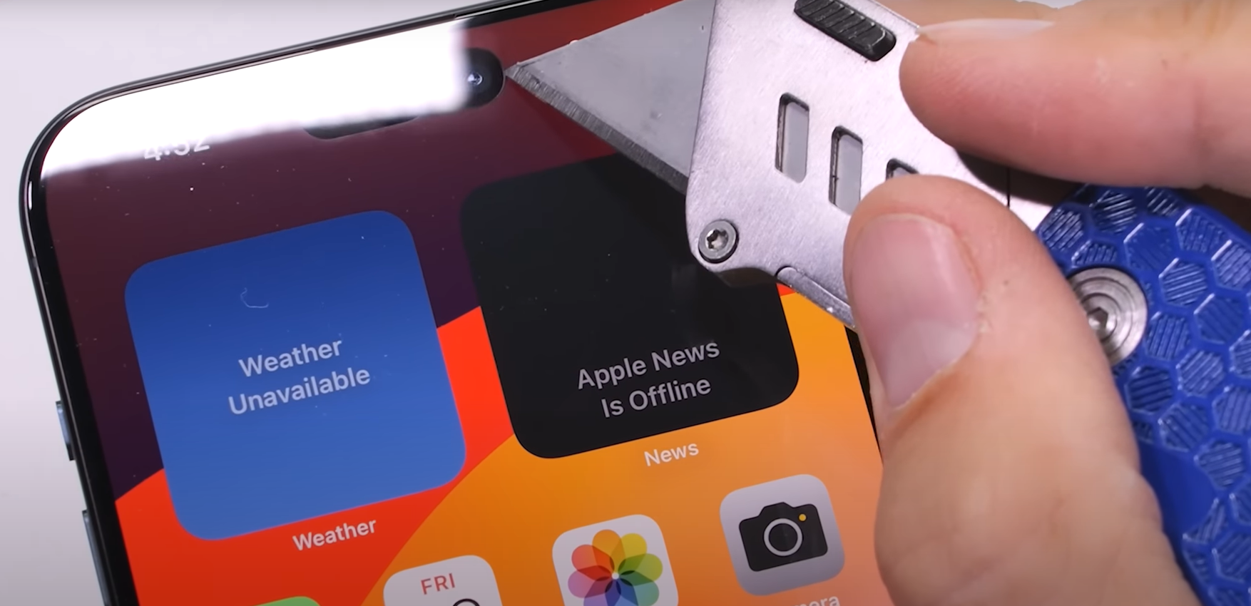 真名為Zack Nelson的YouTuber 「JerryRigEverything」拍片測試iPhone 15 Pro及Pro Max的「耐用性」,又用𠝹刀刮,又用火機燒,最後再徒手屈。結果Pro Max的前相機、主相機及背蓋在玻璃保護,沒有刮痕。屏幕的耐刮測試表現則跟多數手機差不多。