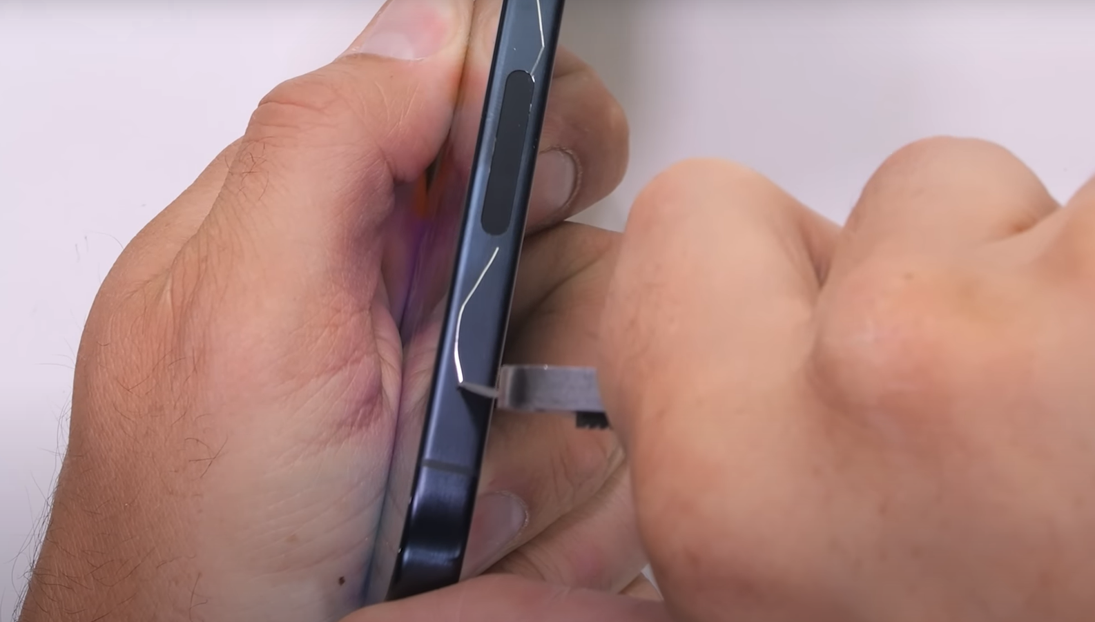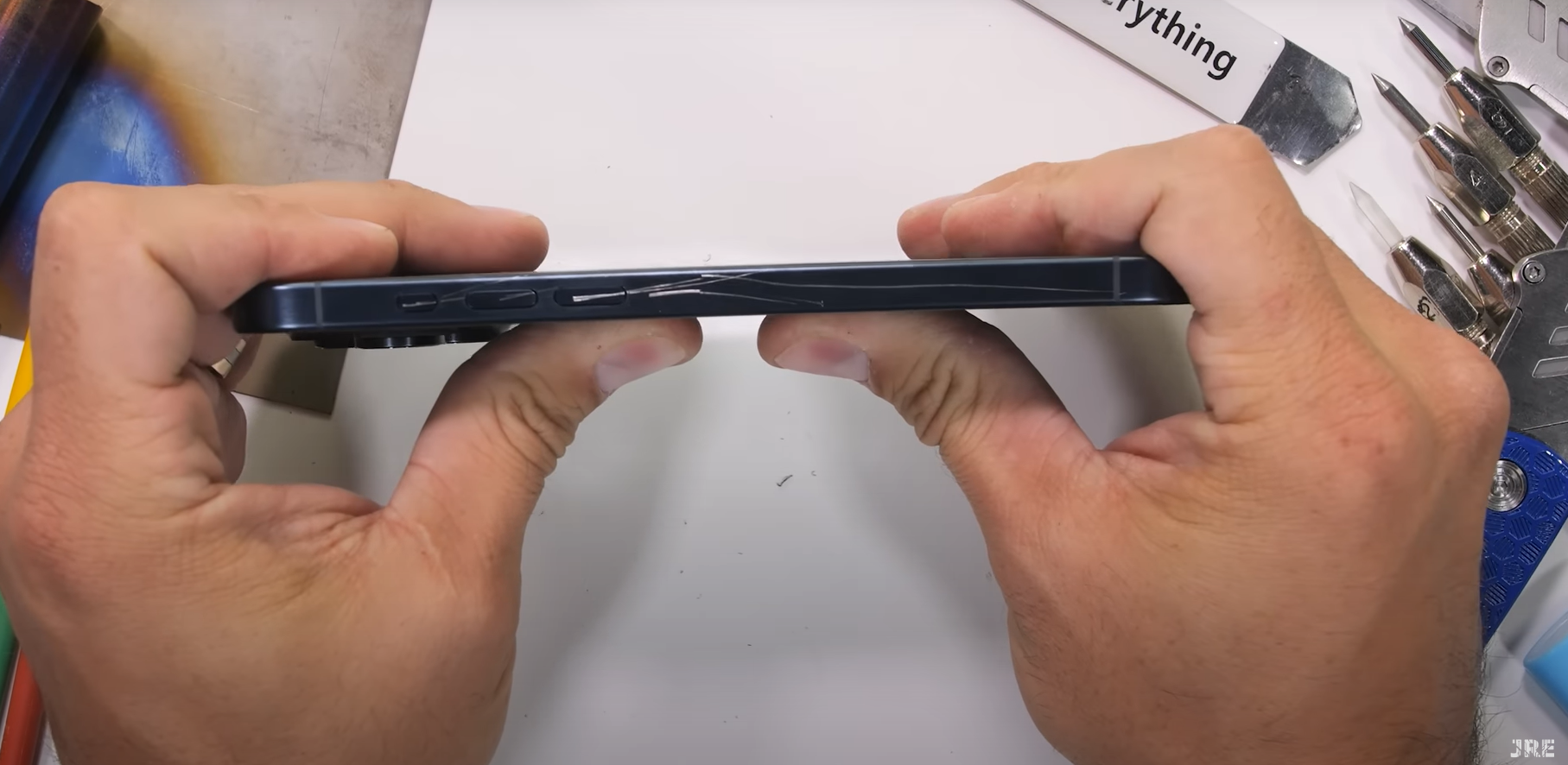 但來到徒手屈曲時,iPhone 15 Pro Max在他手中一屈,機背玻璃隨即「綻放」出大量裂紋。Nelson直言︰「老實講……我沒預料會有這結果(I did not see that one coming)。大家在過去約11年來,也看過我的手機耐用度測試,大部分手機不會(用這種情況下)爛掉」,「而iPhone尤其很少爛」。他並指其iPhone 15 Pro Max的破震來得「不正常地快」(abnormally quick),令他感到震驚。至於體積較小的iPhone 15 Pro則沒有被屈裂。