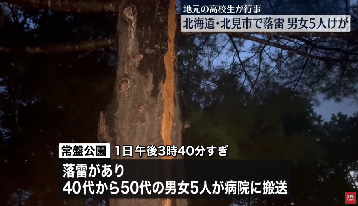 據當地消防部門稱,下午3點40分左右,北海道的北見市常盤公園遭閃電襲擊,5名40歲至50歲的男女被送往醫院,疑似是因雷擊而觸電,所幸5人都只受了輕傷。
