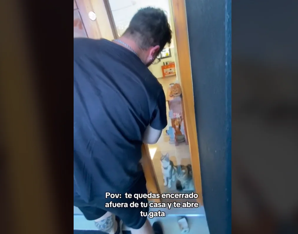 TikTok 用戶桑蒂(santi)某天和爸爸出門,二人卻都忘記帶鑰匙被鎖在門外,3隻愛貓全都在門口隔著玻璃看着。