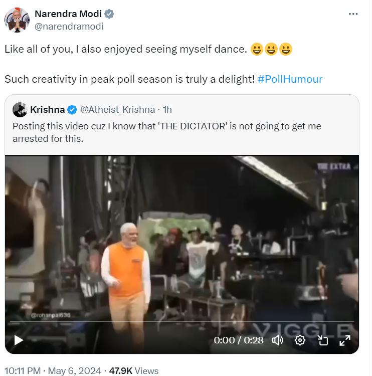 6日,莫迪在X上轉推了一段AI生成的自己跳舞的影片,並表示:「我和大家一樣喜歡看自己跳舞。在選舉高峰期展現的這種創造力確實令人愉悅。」