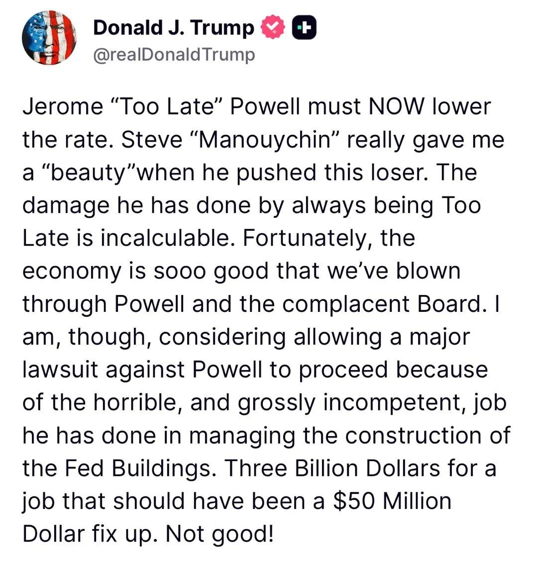 特朗普再次呼籲美聯儲降息,表示考慮對鮑威爾提起訴訟。(AP) 特朗普再次呼籲美聯儲降息,表示考慮對鮑威爾提起訴訟。(Truth Social截圖) 特朗普再次呼籲美聯儲降息,表示考慮對鮑威爾提起訴訟。(資料圖片) 特朗普上月視察儲局翻新工程,並與鮑威爾爆發「口水戰」。(AP) 特朗普上月視察儲局翻新工程,並與鮑威爾爆發「口水戰」。(AP) 特朗普上月視察儲局翻新工程,並與鮑威爾爆發「口水戰」。(AP) 特朗普上月視察儲局翻新工程,並與鮑威爾爆發「口水戰」。(AP)