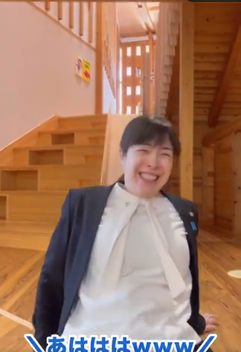 小野田紀美在帖文中稱,參觀了西粟倉村的圖書館,該處採用了西粟倉的木材建成。她表示,館裡還有一座大人也可滑的滑梯,但如果體重較重的人滑下來,就會發生這樣的情況,所以請小心,並附上流淚表情符號🥲。小野田紀美提到,之前有過痛苦的經歷,所以一開始很抗拒玩這個滑梯,但最終也玩了。影片中字幕介紹,「被秘書催促快滑,結果抵抗失敗的小野田」,只見她站在溜滑梯頂端,一直碎碎念,「我以前滑過,滑下去真的會很慘」、「我可不管」,一邊做好準備。接著小野田滑下來,結果力道太猛,整個人急速逼近鏡頭,現場爆笑連連。小野田用岡山方言說「我就說了吧」,女秘書則是繼續大笑、還說「(笑到)肚子痛」,影片在爆笑聲中結束。
