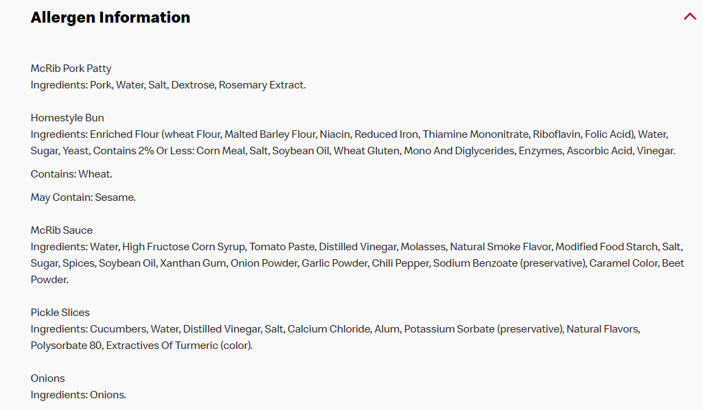 McRib於1982年在美國推出,間中會回歸,有一定的捧場客,最近於去年11月起推出。根據美國麥當勞網站提McRib食材的過敏資訊,McRib的豬肉餅包含豬肉、水和鹽,並沒有豬肋骨肉成分。該款麵包的肉餅只是外型做到像豬肋骨排,事實上並沒有骨。根據上月23日的入稟狀,4名原告人指McRib的宣傳手法誤導,其名字及肉餅的外型,令消費者相信該產品用了真正的豬肋骨肉,採用了高品質的豬肉。他們指,麥當勞知道或應該知道,消費者將被誤導。