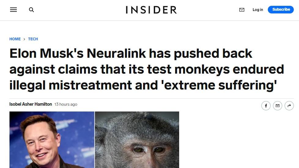 美國新聞網站《商業內幕》(Business Insider)日前報道,動物權組織「責任醫學醫師委員會」(PCRM)表示,從所獲得的獸醫紀錄與驗屍報告顯示,Neuralink測試腦內晶片時,實驗獼猴經歷了護理不足與高度入侵性的腦部植入而帶來的「極度痛苦」,2017年到2020年間Neuralink擁有的23隻實驗猴中,只有7隻倖存下來。另外,有1隻猴子失去部分手指與腳趾,「可能是出於自殘或其他創傷」。