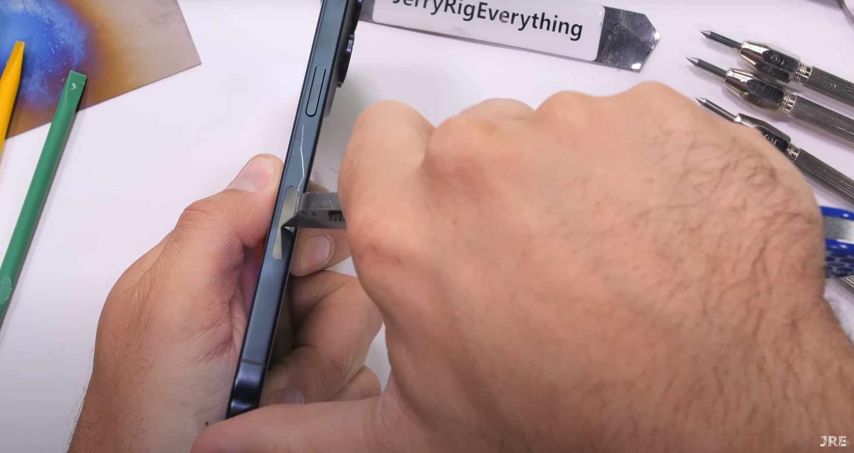 真名為Zack Nelson的YouTuber 「JerryRigEverything」拍片測試iPhone 15 Pro及Pro Max的「耐用性」,又用𠝹刀刮,又用火機燒,最後再徒手屈。結果Pro Max的前相機、主相機及背蓋在玻璃保護,沒有刮痕。屏幕的耐刮測試表現則跟多數手機差不多。