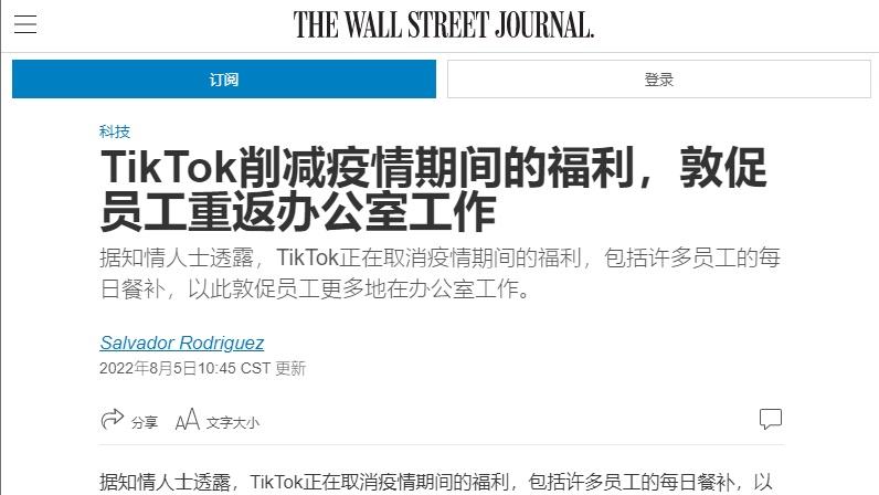 《華爾街日報》(The Wall Street Journal)報道指,TikTok提前逾1個月向員工發出通知,希望他們回到辦公室。有員工指,TikTok為推動他們重返辦公室,他們將不再能報銷網絡和健身房費用。TikTok發言人指出,公司這些費用的政策還未調整。