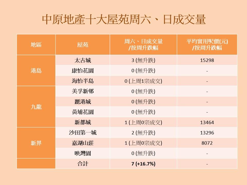 一手新盤熱賣,二手交投持續受壓,回升需時。中原地產十大屋苑本周末錄得7宗成交,按周回升1宗,零成交屋苑減少1個,共有6個。中原地產亞太區副主席兼住宅部總裁陳永傑表示,一手市場熱鬧,料周末一手成交宗數可達200宗,連帶二手睇樓氣氛回暖,惟二手成交量需待一手購買力消化,才逐漸回升。