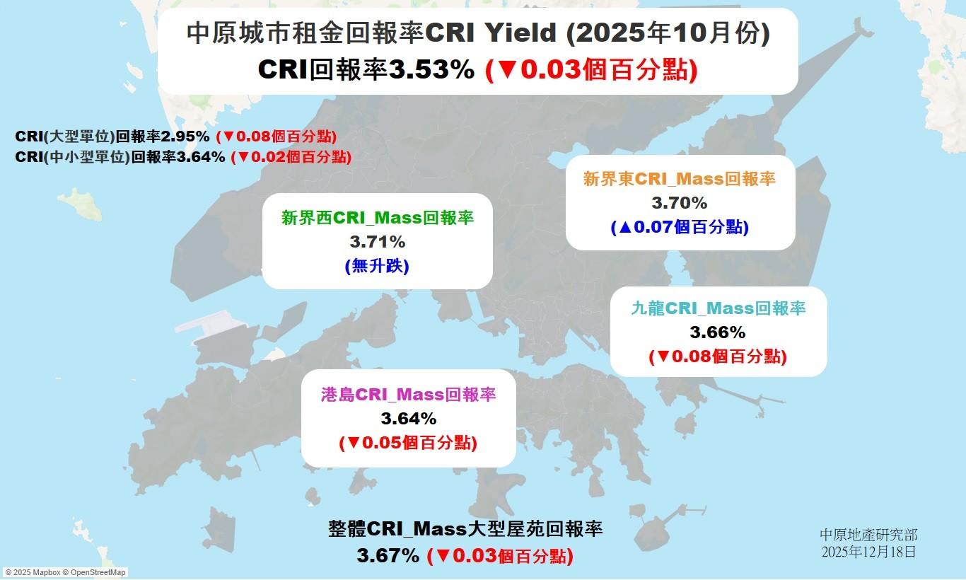 中原地產研究部高級聯席董事楊明儀指出,2025年10月CRI回報率最新報3.53%,按月跌0.03個百分點,連跌2個月共0.07個百分點。10月租金升勢減慢,同期樓價則受惠重啟減息升幅明顯加大,樓價升幅跑贏租金升幅,影響回報率輕微下降。但CRI回報率仍為近14年第4高,在2011年12月水平徘徊。第四季租賃淡季,用家對租盤需求持續,租金維持高位靠穩,而樓價繼續平穩向升,展望今年底回報率可企穩3.4厘以上。