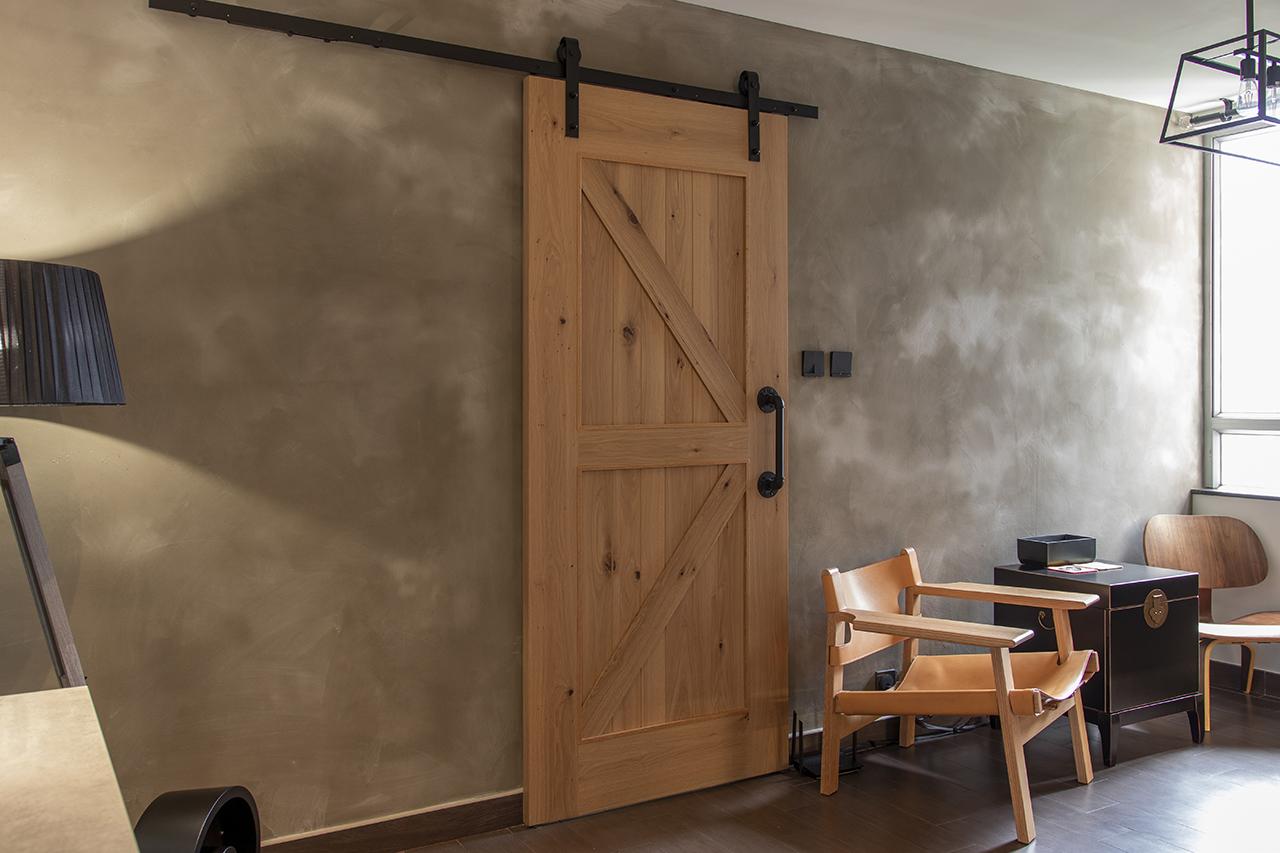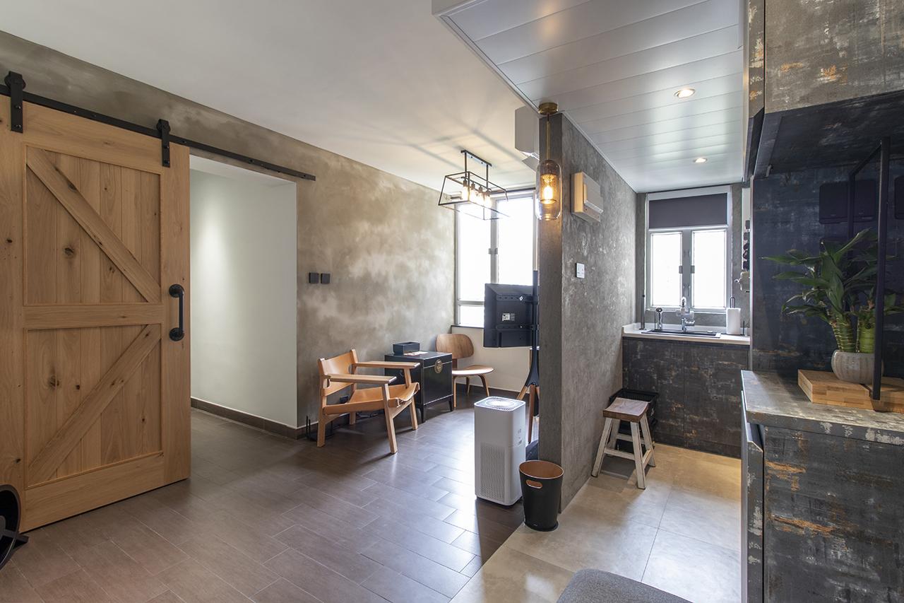 戶主喜歡輕工業風的室內設計,於是以灰色做主色調,並用了不少鐵的元素,例如燈飾,令單位帶有型格硬朗的感覺。而連接客飯廳與睡房的走廊位置,戶主選擇安裝穀倉門,穀倉門的設計源於歐美農莊,特別之處在於安裝後仍然可以看到金屬滑輪、滑軌,風格鮮明,與輕工業的家居十分配搭。