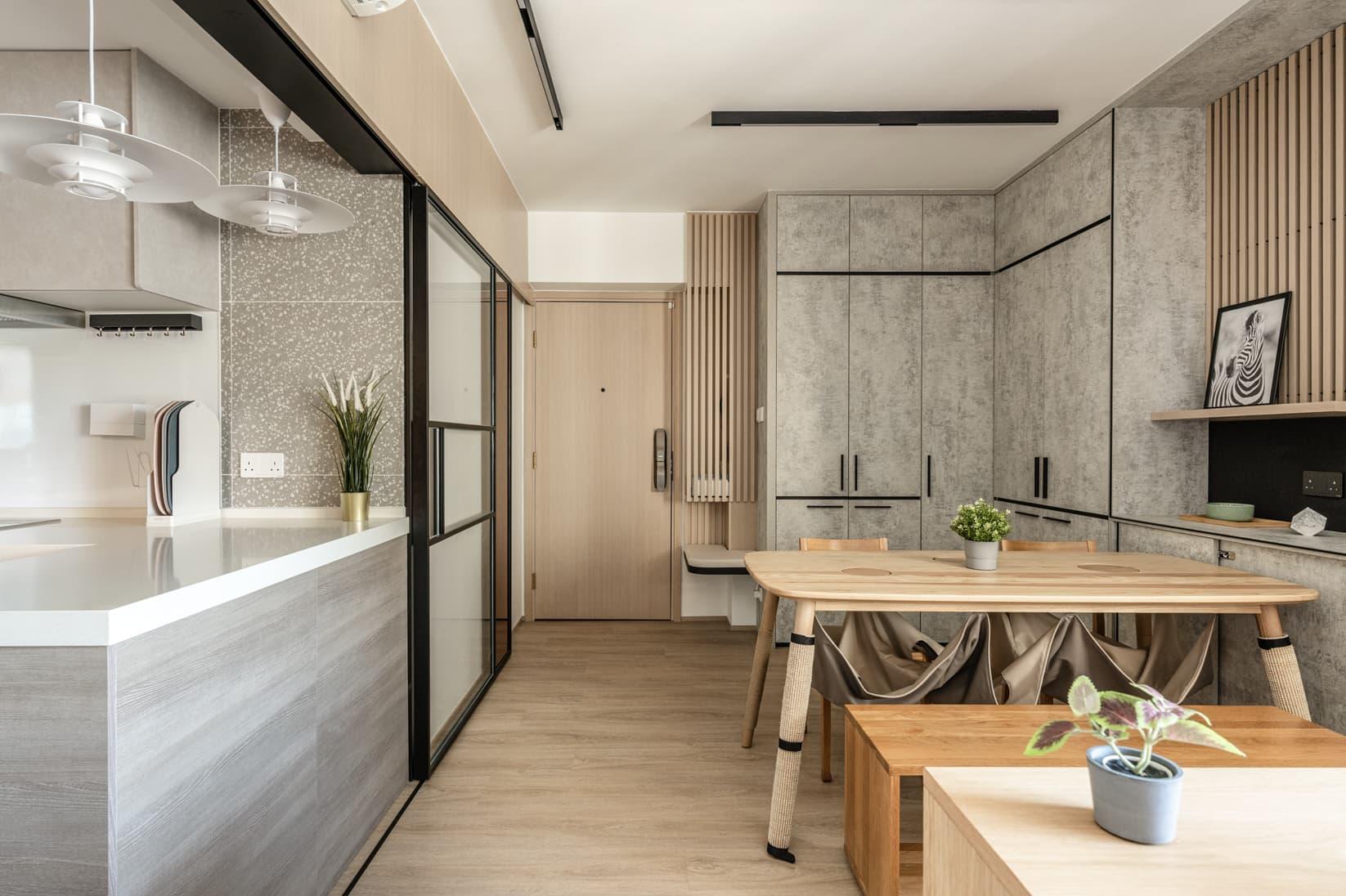 整個空間由不同種類的木質傢具交織而成,例如淺暖色的玄關線條裝飾、木製餐桌和電視櫃,以及櫻桃木色的座椅、長凳和及腰書櫃,配以灰色木紋的收納櫃和櫥櫃,營造樸實無華和舒適自然的家居氛圍。