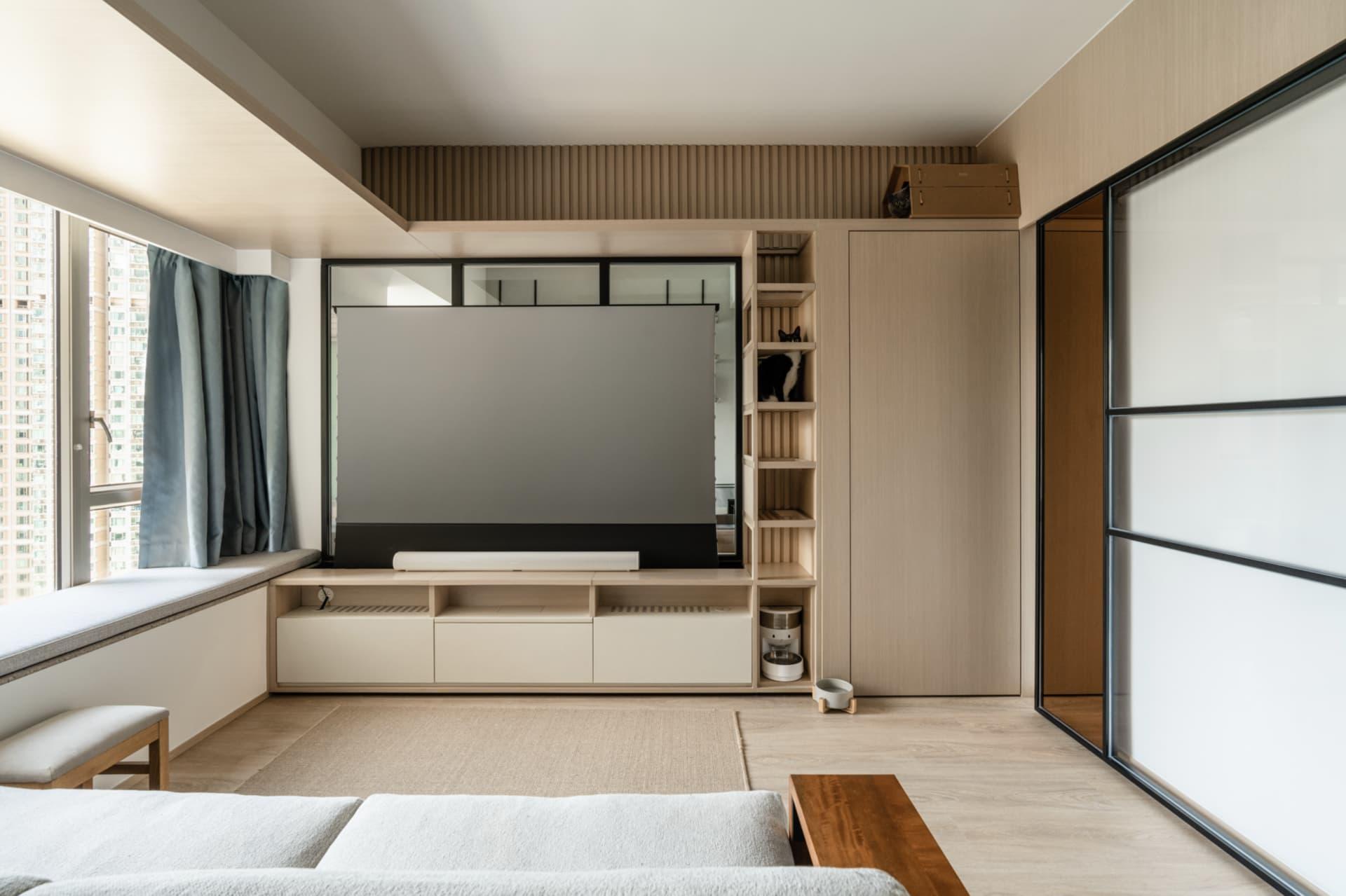 為配合屋主的生活習慣,設計師特別為單位增添智能家居元素,包括投影機及可智能遙控的電動窗簾,讓屋主享受更優質的觀影體驗。