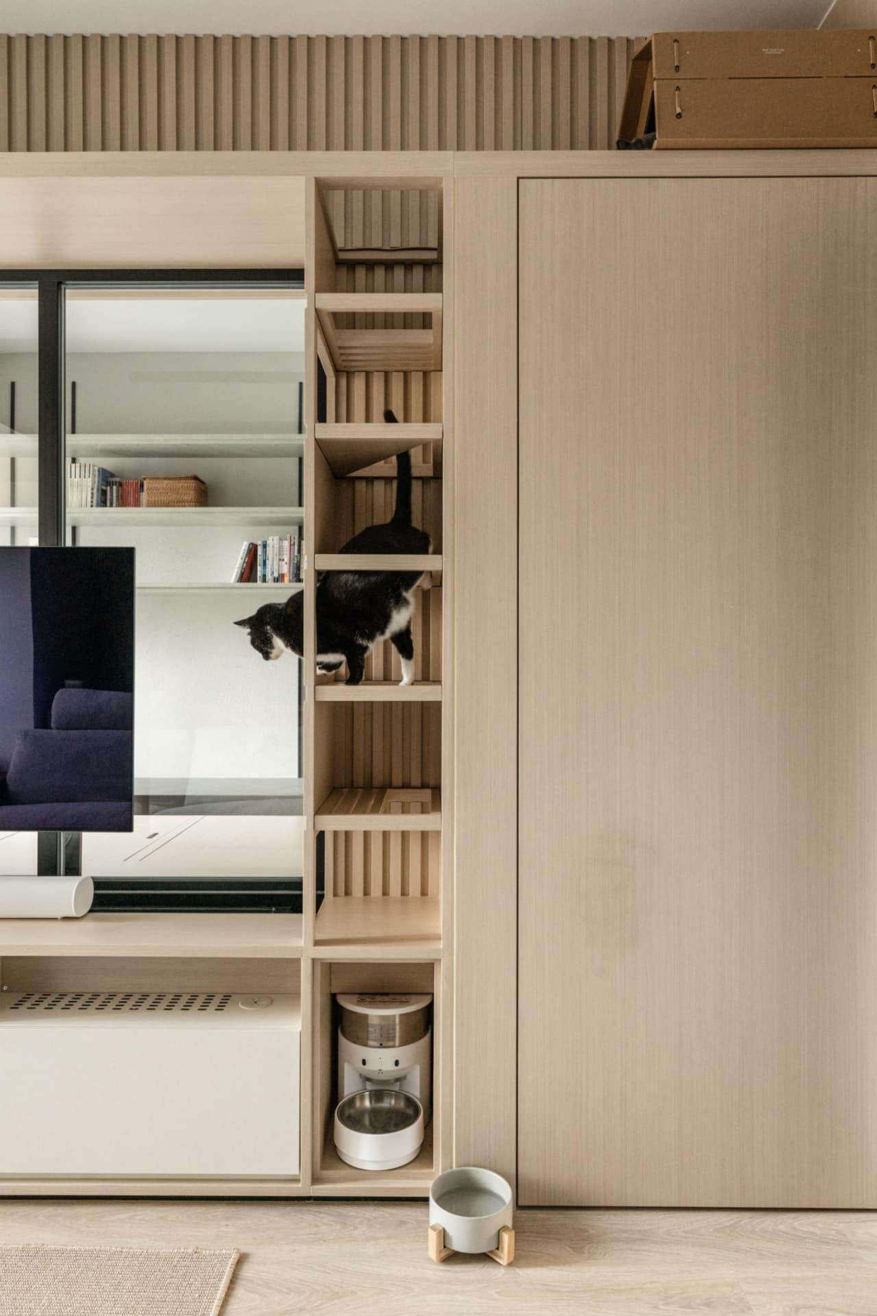 Alvin指:「由於屋主擁有三隻貓,如何在家居加入寵物飲水機和貓砂盤而不影響空間美觀,亦是考量之一。」設計團隊事先預留較隱蔽的空間放置寵物用具,例如在梳化底擺放三個食器,既方便主子們進食,又能避免食物弄污地板,影響整體觀感。