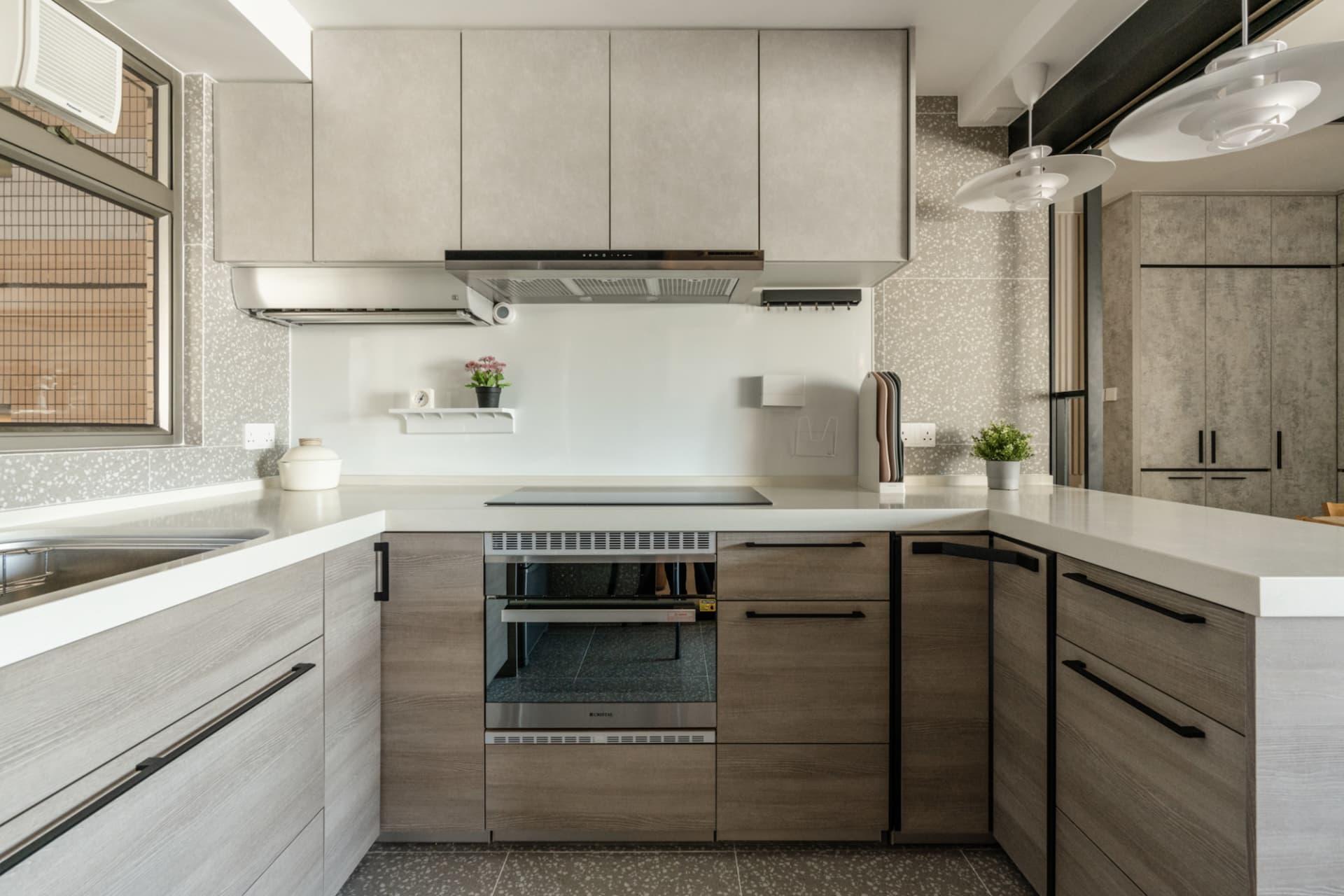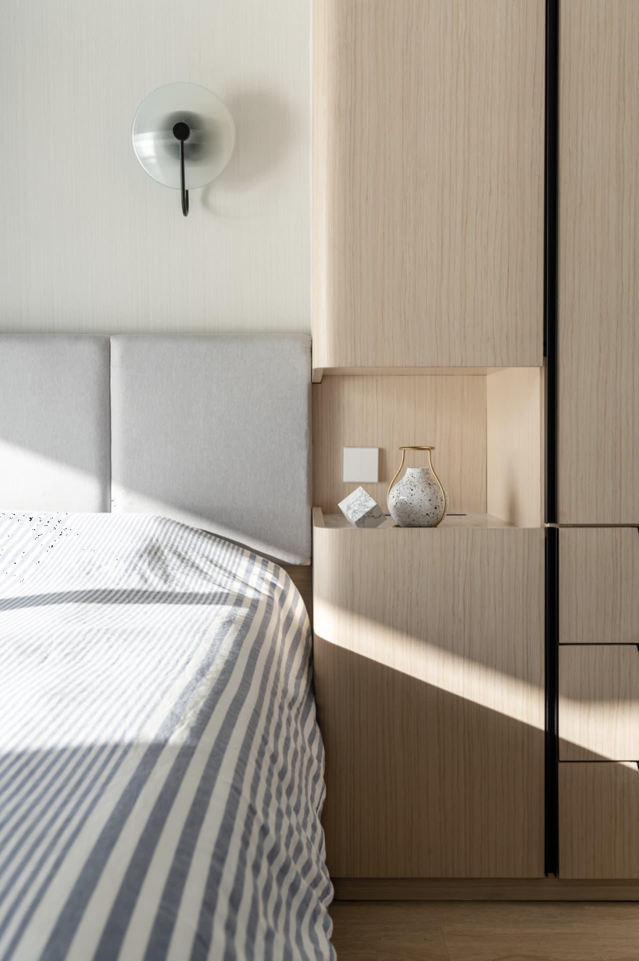 為了讓三位主子擁有更寬敞和充裕的活動空間,設計師將原本的三房改為兩房兼開放式廚房格局,以騰出更多實用空間。而主人房和客廳之間增設了趟門以劃分區域,開放式廚房同樣設有玻璃趟門,可阻隔煮食時的油煙異味,保持空間的通透感之餘,又可保持空間整潔。