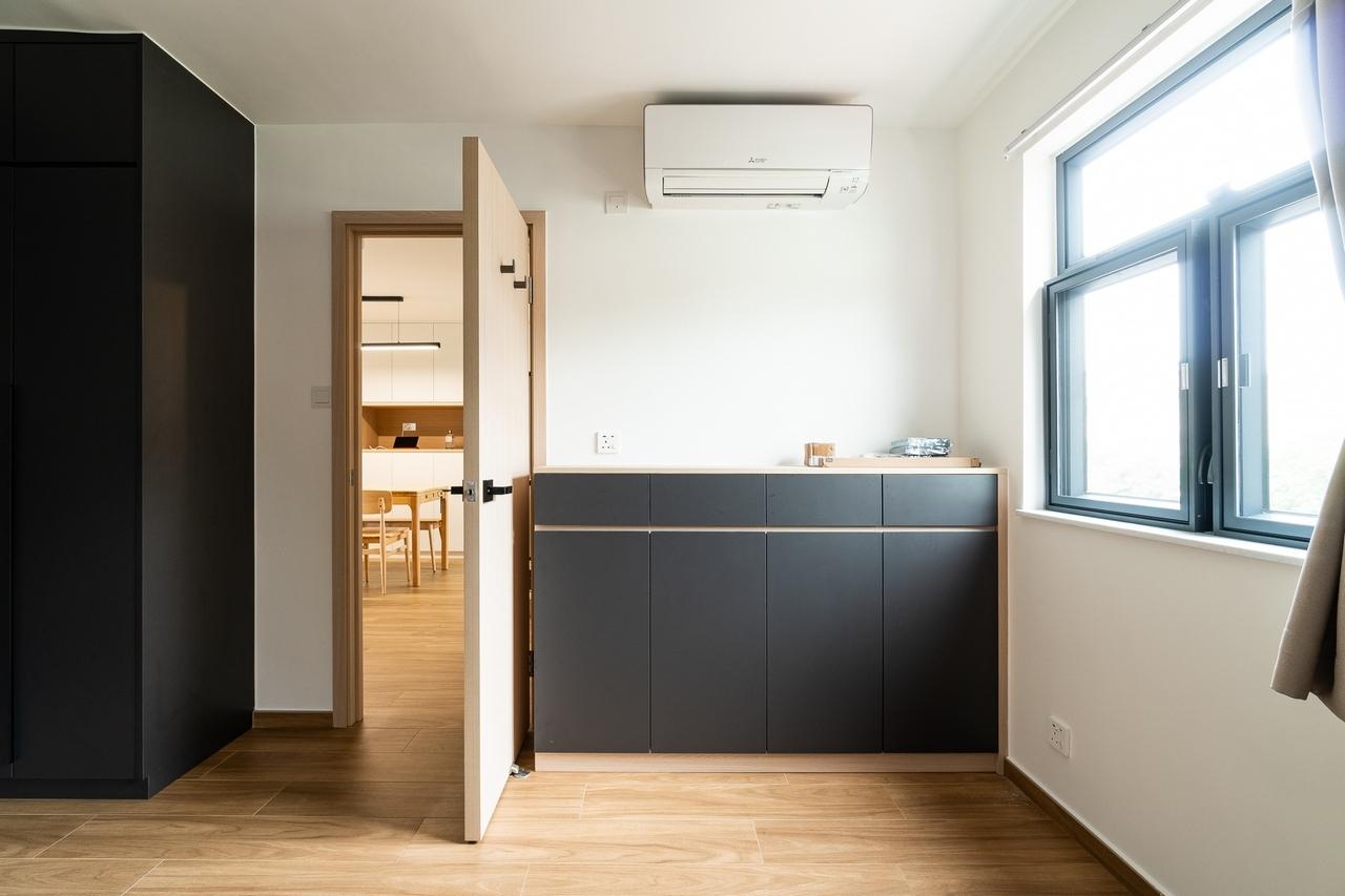 兩位主人喜歡的風格各異,男主人較喜歡深色及現代型格風,但女主人就鍾意無印風,因而設計師需要巧妙地結合兩種風格元素。單位主色為木色,但同時選用黑、深灰及水泥色的傢俬,作為互相襯托。例如單位大門及睡房門同樣是木色,但門柄就選用了黑色,配搭起來亦十分好看。