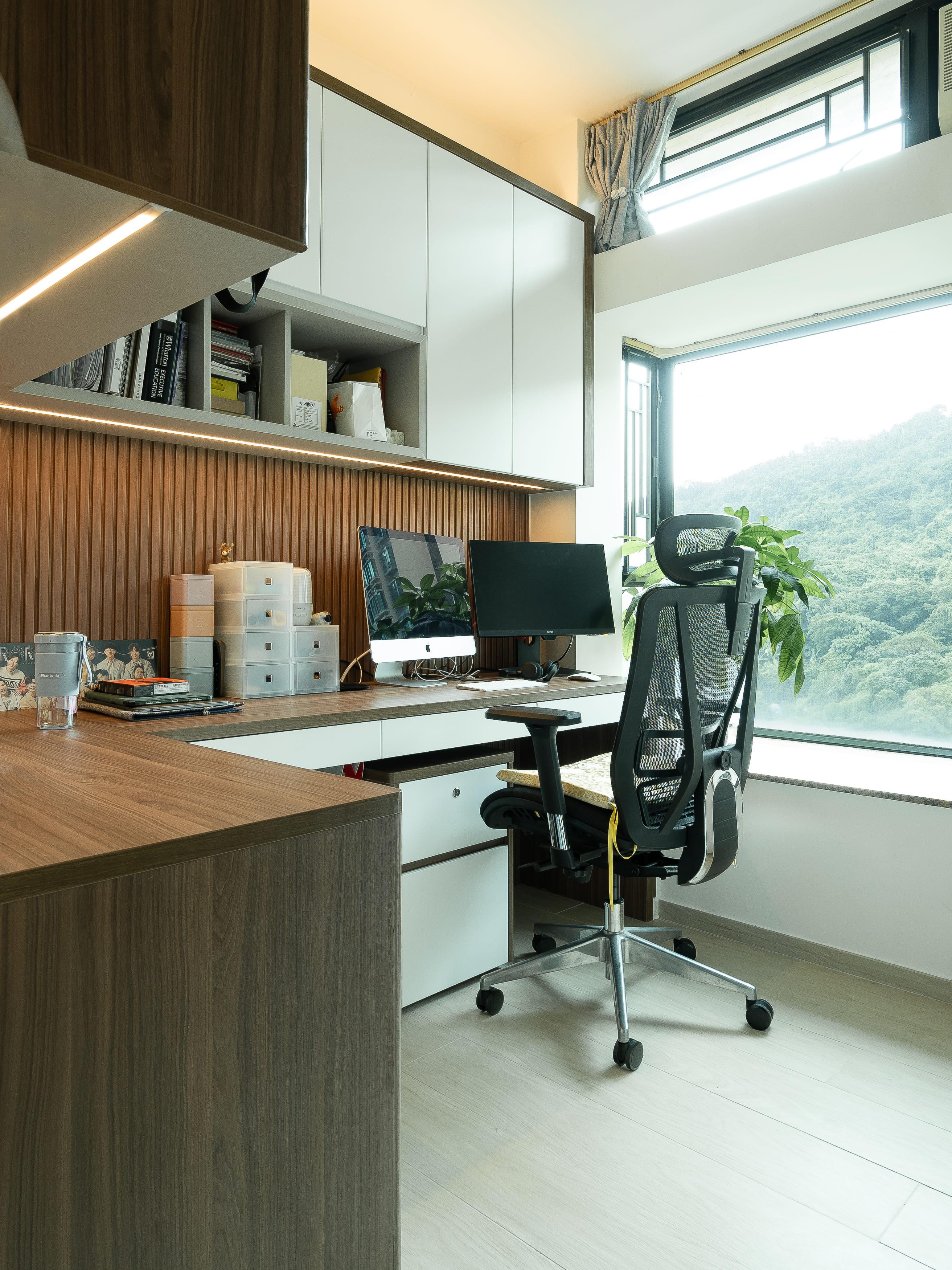戶主喜歡簡約的設計元素,電視櫃下方造了一個矮櫃,牆身兩側就用了木條子的元素,帶點日式味道之外又不會過份單調,窗台位置除了放了綠色盆栽還有坐墊,除了有裝飾的用途外,亦令自己可以閒時可以望窗外的山景,放鬆心情,偶爾亦變成了愛狗的睡床。
