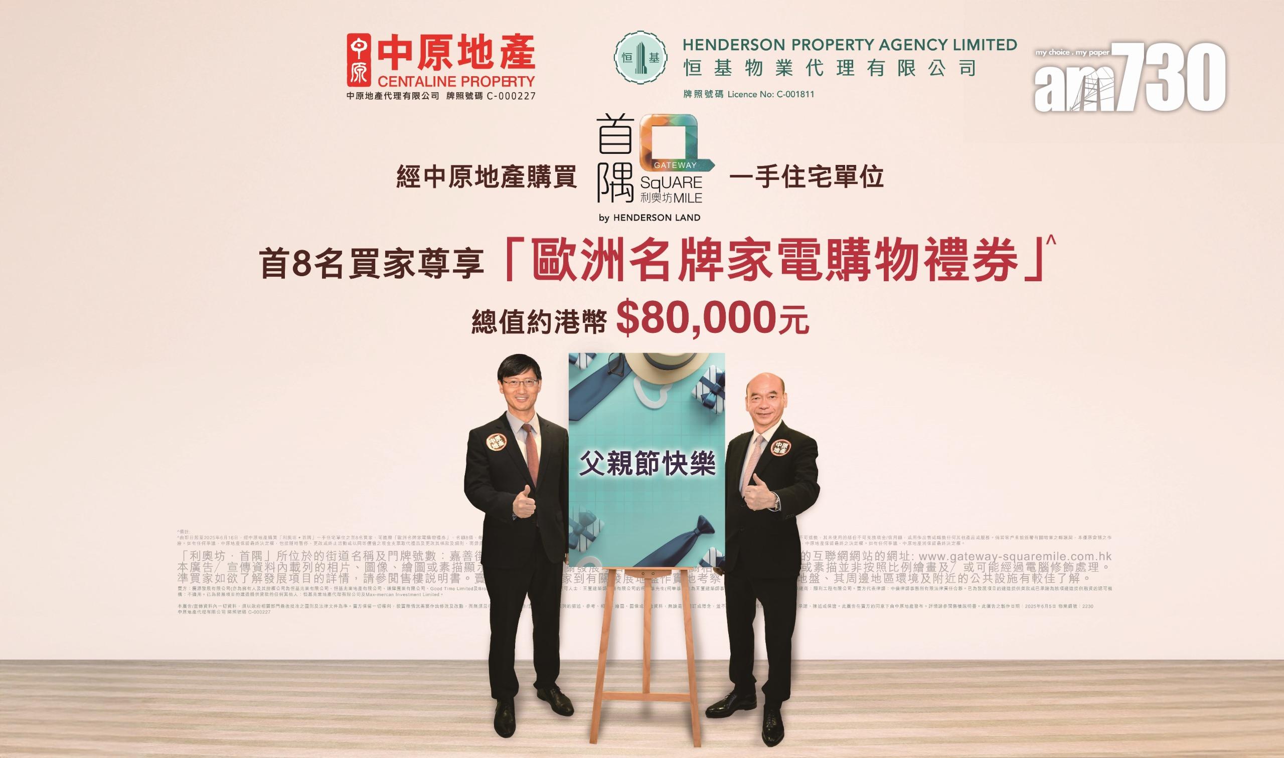 為慶祝父親節即將來臨,中原地產特意為「利奧坊‧首隅」買家推出全新置業優惠,由即日起至2025年6月16日,經中原地產購買「利奧坊‧首隅」一手住宅單位之首8名買家,可獲贈「歐洲名牌家電購物禮券」,名額8個,每個優惠名額約值1萬元,總值約8萬元。優惠先到先得,送完即止。