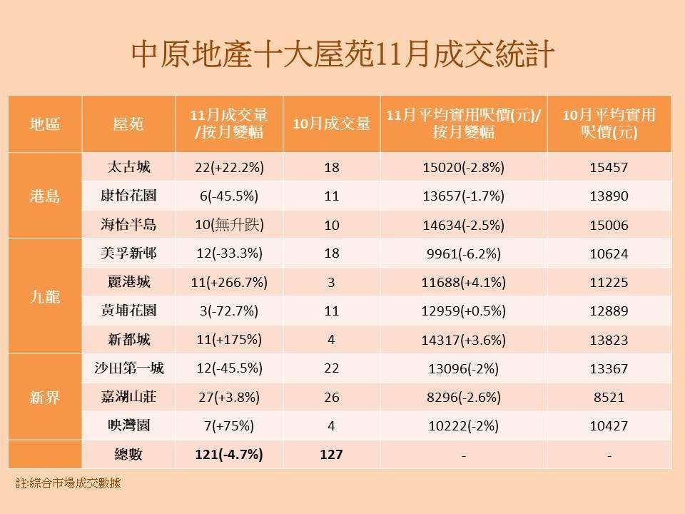 據中原地產統計,十大屋苑11月份錄得121宗成交,較10月份的127宗,減少6宗或4.7%,但連續2個月超過120宗成交。