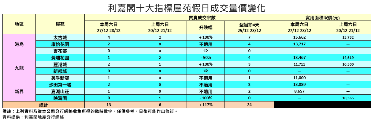 在過去四天假期的十大指標屋苑買賣當中,若按地區劃分,港島區交投最旺,錄得11宗買賣,而九龍及新界區則各錄8宗及5宗成交。若以屋苑劃分,太古城表現凌厲,勁錄7宗,康怡花園及黃埔花園同錄4宗,麗港城及沙田第一城也各錄3宗成交;緊隨其後為嘉湖山莊的2宗及美孚新邨的1宗;至於杏花邨、新都城及映灣園則齊齊「捧蛋」,於聖誕節長假期間暫未錄得成交。
