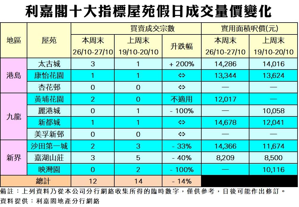 綜合利嘉閣地產分行網絡數據,在過去的周六日(26至27日)十大指標屋苑錄約12宗成交,按周減少14%。