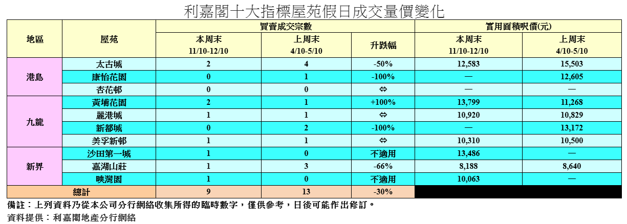 廖偉強續指,現時圍繞樓市的各項利好消息並未有隨貿戰而消失,加上市場普遍憧憬本月底有機會再減息,可以為樓市的發展帶來實質的支持。統計利嘉閣地產分行網絡數據,在過去的周末(10月11至12日)十大指標屋苑錄得9宗二手成交,較對上一個周末(10月4至5日)的13宗,按周回落約30%,重返單位數水平。