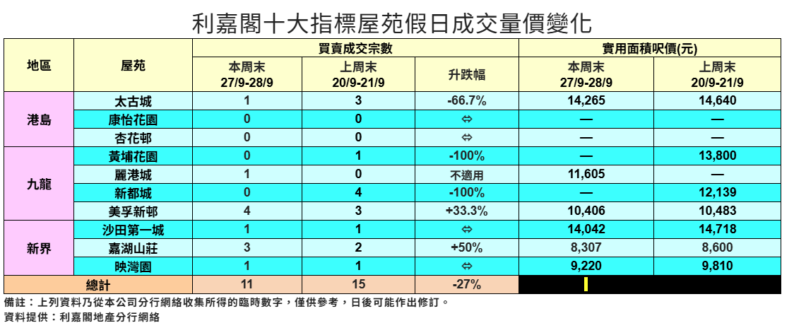 利嘉閣地產總裁廖偉強表示,樓價持續上升,業主心雄,令買家還價難度增加,加上不少一手新盤仍以相對優惠價推售,分薄二手客源,致二手成交略回;但相信第4季整體樓市走勢向好。綜合利嘉閣地產分行網絡數據,在過去的周末(9月27至28日)十大指標屋苑錄得11宗二手成交,較對上一個周末(9月20至21日)的15宗,按周減少4宗或27%,連續2周維持雙位數。