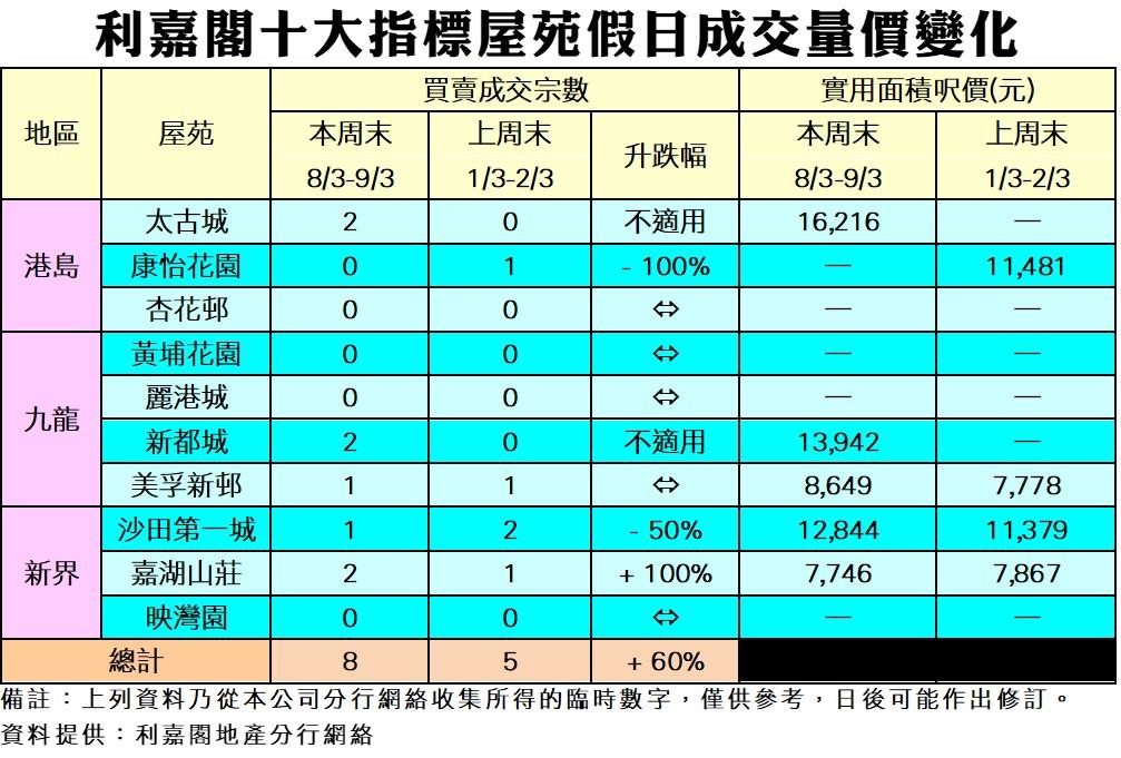 綜合利嘉閣地產分行網絡數據,在過去的周末(8至9日)十大指標屋苑錄得8宗二手成交,較對上一個周末(1至2日)的5宗,按周增加3宗或60%。