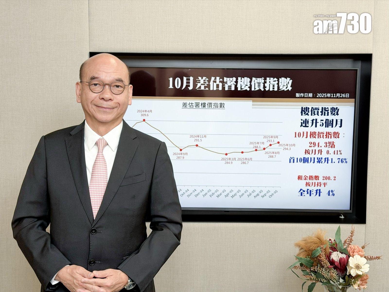 2025年10月私人住宅售價指數報294.3點,按月上揚0. 41%,連升5個月。