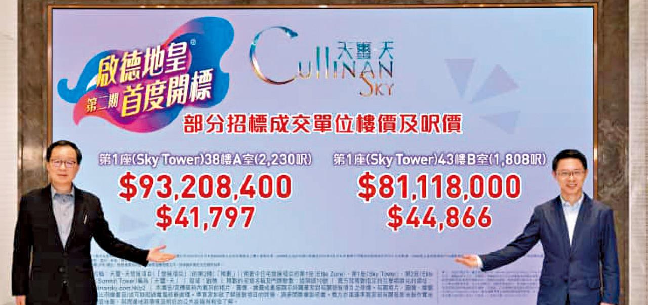 一手市場氣氛暢旺,新盤銷情理想。新鴻基地產(016)旗下啟德「天璽.天」第2期以現樓推售,昨日首度公布招標結果,錄得10宗成交,套現逾5.59億元。全數為四房單位,成交價3,032.8萬至9,320.84萬元,成交呎價33,401至44,866元。當中成交價最高單位為1座(Sky Tower)38樓A室,屬四房雙套房及工作間及化妝間連私人電梯大堂間隔,實用面積2,230方呎,連1個車位以9,320.84萬元售出,呎價41,797元。成交呎價最高單位為1座(Sky Tower)43樓B室,四房雙套房及工作間連私人電梯大堂間隔,實用面積1,808方呎,連2個車位以8,111.8萬元售出,呎價44,866元。