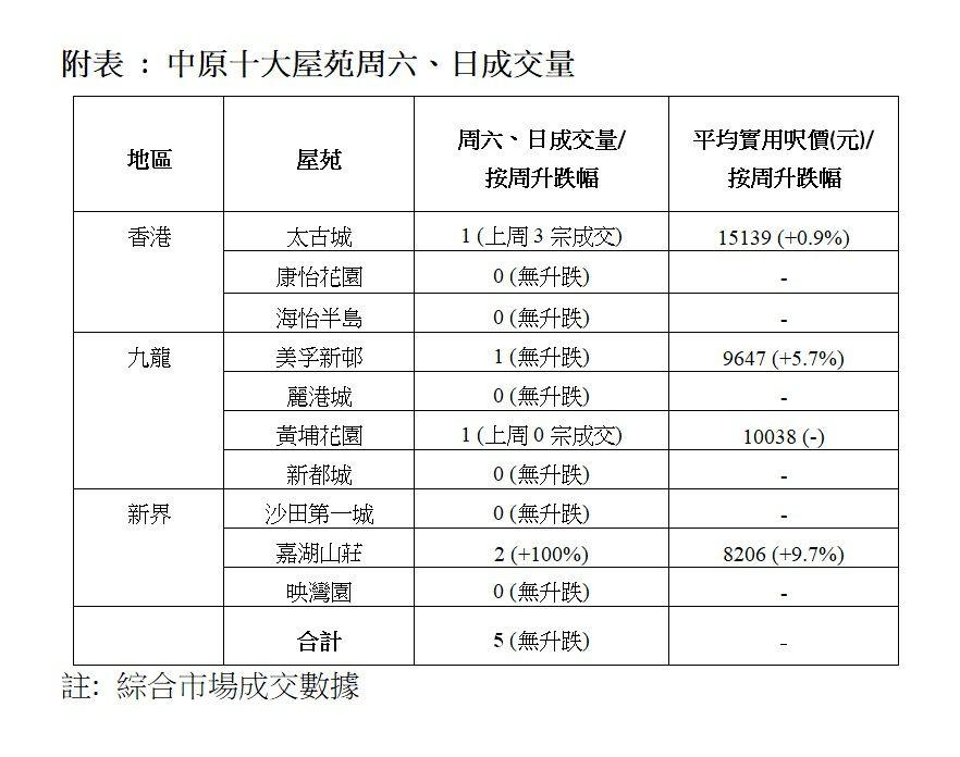 中原十大屋苑本周六、日成交量。