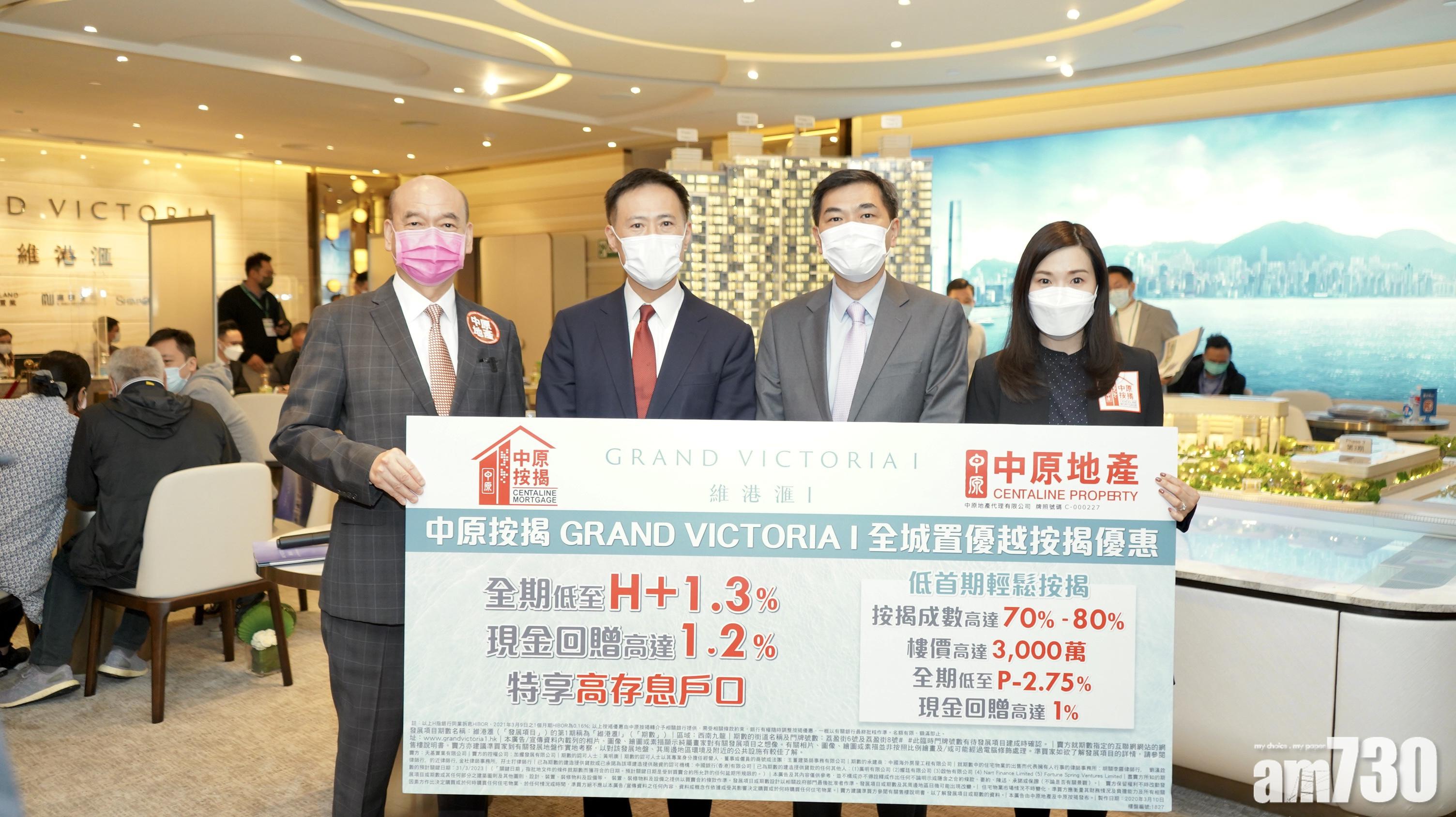 至於中原按揭公布,為維港滙買家特設全新按揭優惠,中原按揭董事總經理王美鳳指,是次推出的「GRAND VICTORIA 維港滙全城置優越按揭優惠」,全期按息低至H+1.3厘,以3月10日一個月拆息0.17厘計,實際息率低至1.47厘,封頂息率低至P-2.75厘(現為2.5厘),並設特高現金回贈高達貸款額1.2%。與此同時,此計劃客戶亦兼享與按息一致之高存息戶口,客戶可把資金存入戶口賺取高息。