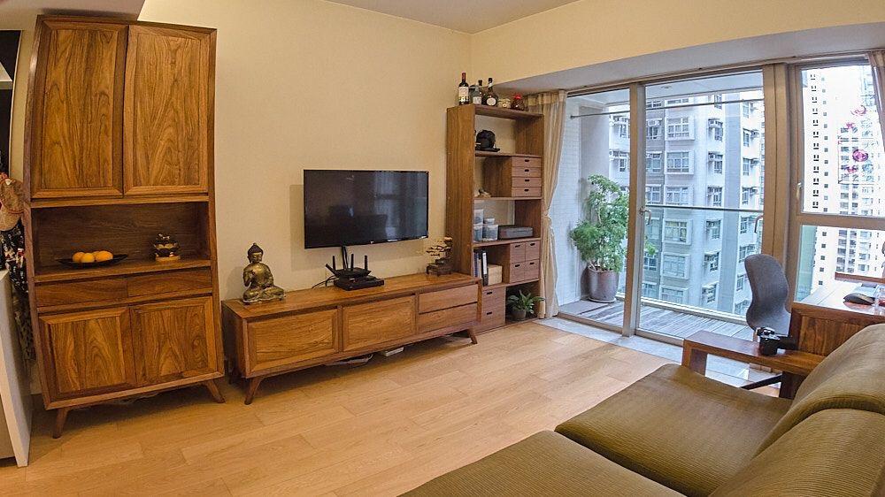 全屋木質裝修和傢具,單一但不單調;大廳外接露台,窗外以樓景為主,尚算開揚、不壓迫。